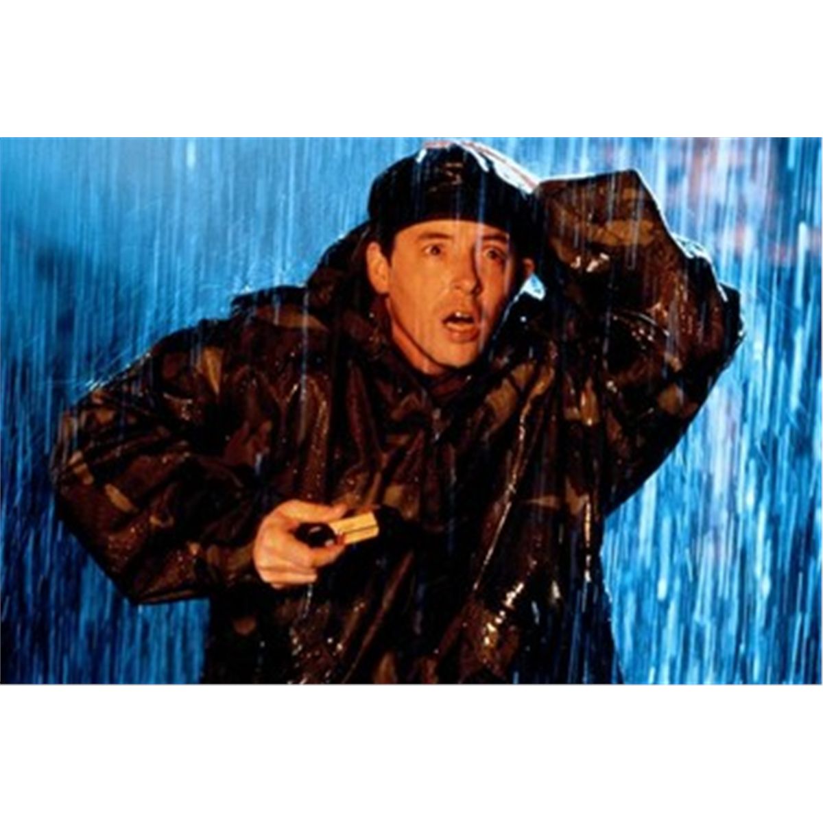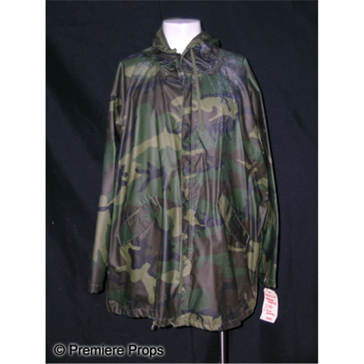 Green camo military rain jacket worn by Matthew Broderick in Godzilla (1998). Broderick starred as Dr. Tatopoulos in this remake of the 1954 monster classic. Tatopolous serves as the story's hero and mounts a campaign to destroy the scaly menace. Includes a studio hangtag with Broderick's name handwritten on it. Uniquely, this costume was packaged with two bags of debris from the film's disaster sequences. One bag is labeled "Debris from Scene 86" and the other is full of small prop rocks and soil.
