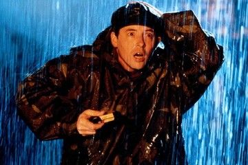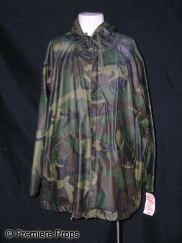 Green camo military rain jacket worn by Matthew Broderick in Godzilla (1998). Broderick starred as Dr. Tatopoulos in this remake of the 1954 monster classic. Tatopolous serves as the story's hero and mounts a campaign to destroy the scaly menace. Includes a studio hangtag with Broderick's name handwritten on it. Uniquely, this costume was packaged with two bags of debris from the film's disaster sequences. One bag is labeled "Debris from Scene 86" and the other is full of small prop rocks and soil.
