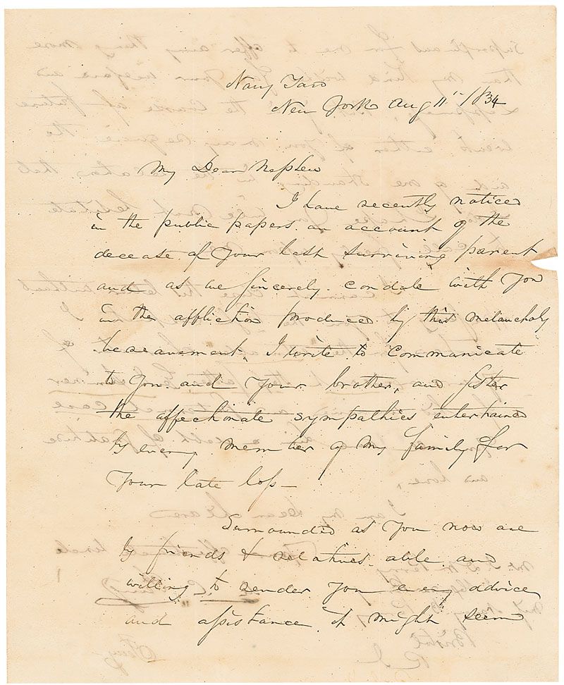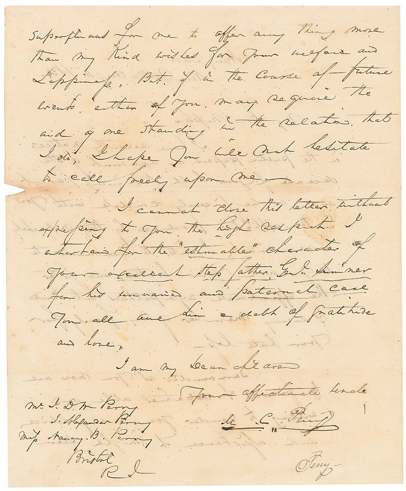 American naval officer (1794–1858) who took a leading role in the establishment of international trade with the formerly insular nation of Japan. ALS signed “M. C. Perry,” three pages on two adjoining sheets, 8 x 9.75, August 11, 1834. Letter to the child