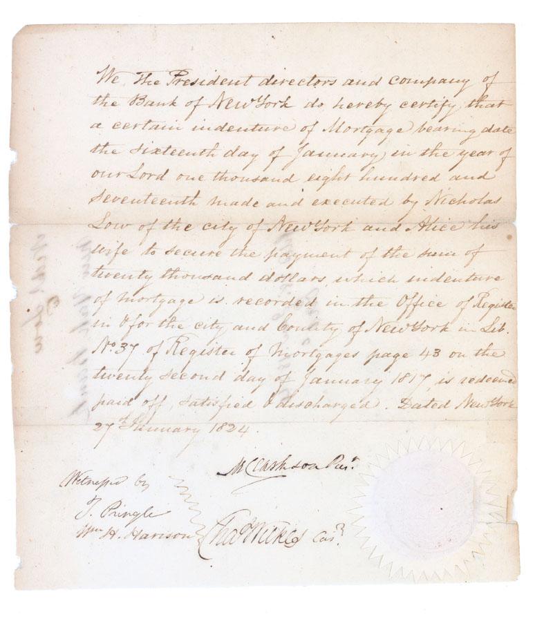 MATTHEW CLARKSON. Clarkson was a soldier and public official. DS 8" x 9".1pp. New York. January 27, 1824 A document signed “M Clarkson Prest” as president of the Bank of New York, certifying that an indenture of mortgage has been paid: “We, the President directors and company of the Bank of New York do hereby certify that a certain indenture of Mortgage…executed by Nicholas Low…to secure the payment of the Sum of twenty thousand dollars...is redeemed, paid off, satisfied & discharged…”. the embossed paper seal attached at bottom right is intact and there is minor paper loss at edge that affects nothing. It was professionally silked on verso and Clarkson’s signature is dark and clean.