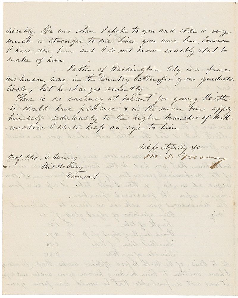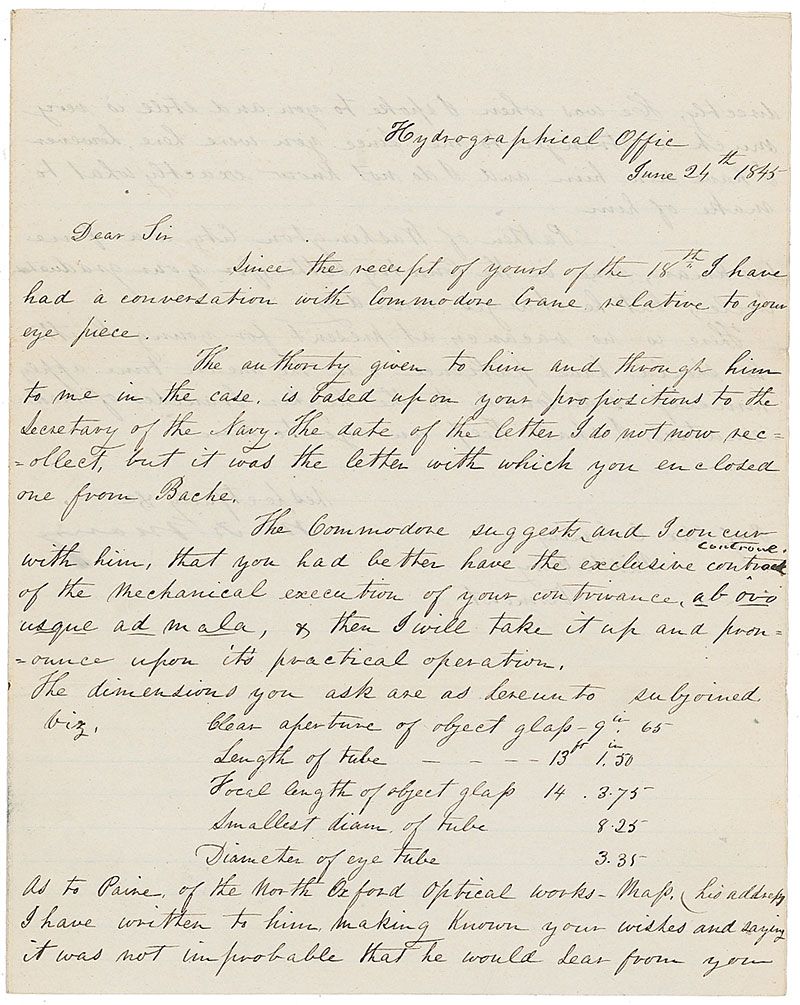 Naval officer and oceanographer (1806–1873) who published the first textbook of modern oceanography. LS signed “M. F. Maury,” one page both sides, lightly-lined, 8 x 10, June 24, 1845. Letter to Professor Alexander Twining, penned while Superintendent of the Depot of Charts and Instruments of the Navy Department at Washington, regarding a naval telescope. In part: “I have had a conversation with Commodore Crane relative to your eye piece. The authority given to him and through him to me in the case, is based upon your propositions to the Secretary of the Navy. The date of the letter I do not now recollect but, it was the letter with which you enclosed one from Bache. The Commodore suggests and I can concur with him, that you had better have the exclusive contract of the mechanical execution of your contrivance…and then I will take it up and pronounce upon its practical operation.” In fine condition, with a light vertical fold through a single letter of signature.