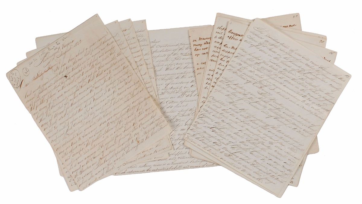 LS signed “M. F. Maury, C. Navy,” 23 pages, 7.75 x 9.75, August 4, 1862. Letter to Robert Fitz Roy in London, giving an account of the war in an effort to gain English recognition of the Confederacy. In part: “It has been about a year since I last wrote you; since that time, the war has passed through several phases and Lincoln has tried it on as many new tacks. At first, you recollect, he only intended to repossess and occupy the public places in the South…The battle of Manassas satisfied him that that wouldn’t do…His object now is no longer to ‘repossess’ the custom house and occupy the public places of the South, but to subjugate and exterminate a whole people…The Yankees are fighting for self government they say—they are doing battle for the freedom of man, for a free press, free speech, for free worship and the right of self government…Many Englishmen seem, to think that African Slavery is at the bottom of all our present troubles; no such thing. The cause of them are deep seated and ramified…The old Government of the United States had become utterly corrupt—and it had corrupted people, with or without slavery, the dissolution of that government was bound to occur…And in proof that we understand better than you, the smothered animosity of the northern mind against us, behold the bitterness, the envenomed hatred, the Savage and barbarous spirit in which they are waging this war upon us, Hayman who excited the indignation of the London Brewers to such a pitch, was mild and merciful in comparison to some of Lincoln’s Lieutenants…They who hold that slavery is the cause of this war, shew that they have by no means been attentive observers or close students of the American government, its institutions, its operations and people. The truth is, the government had, in many ways and for divers reasons, ceased to answer the purposes for which it was established. In that fact and not in slaves, is to be found the cause of this war.” Maury goes on to discuss the economics, trade, and the development of the Confederate Navy. Scattered foxing, some dampstaining and brushing to ink throughout, and a few small edge tears, otherwise fine condition. Accompanied by a custom-made clamshell case.