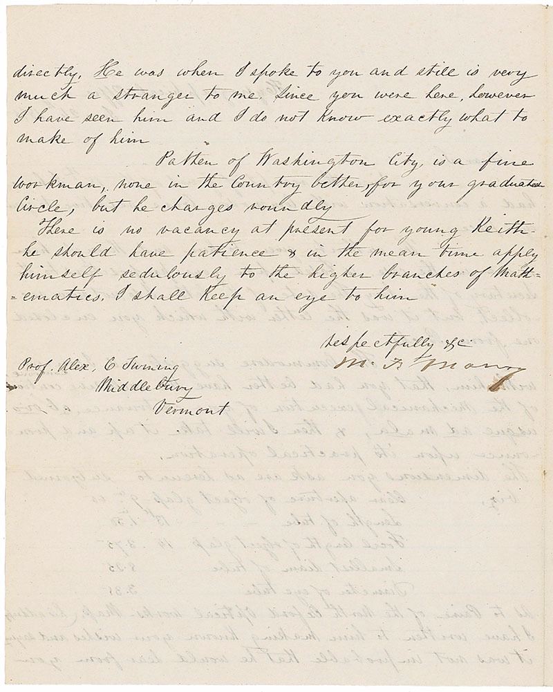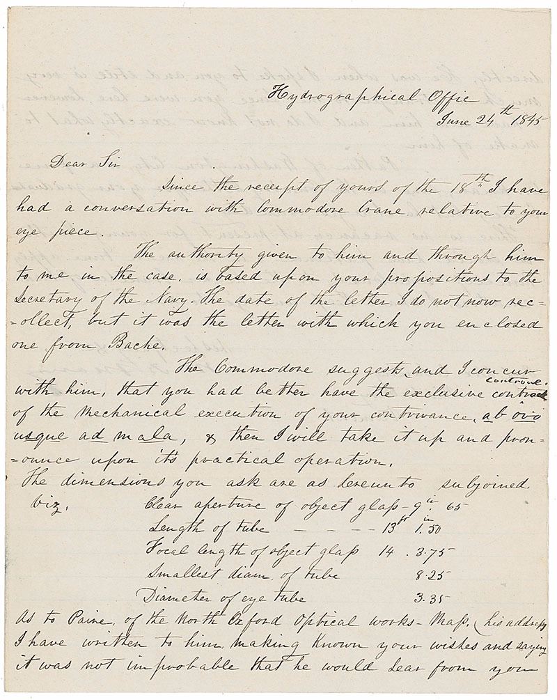 Naval officer and oceanographer (1806–1873) who published the first textbook of modern oceanography. LS signed “M. F. Maury,” one page both sides, lightly-lined, 8 x 10, June 24, 1845. Letter to Professor Alexander Twining, penned while Superintendent of the Depot of Charts and Instruments of the Navy Department at Washington, regarding a naval telescope. In part: “I have had a conversation with Commodore Crane relative to your eye piece. The authority given to him and through him to me in the case, is based upon your propositions to the Secretary of the Navy. The date of the letter I do not now recollect but, it was the letter with which you enclosed one from Bache. The Commodore suggests and I can concur with him, that you had better have the exclusive contract of the mechanical execution of your contrivance…and then I will take it up and pronounce upon its practical operation.” In fine condition.