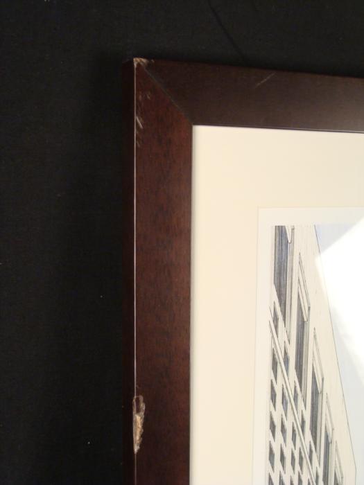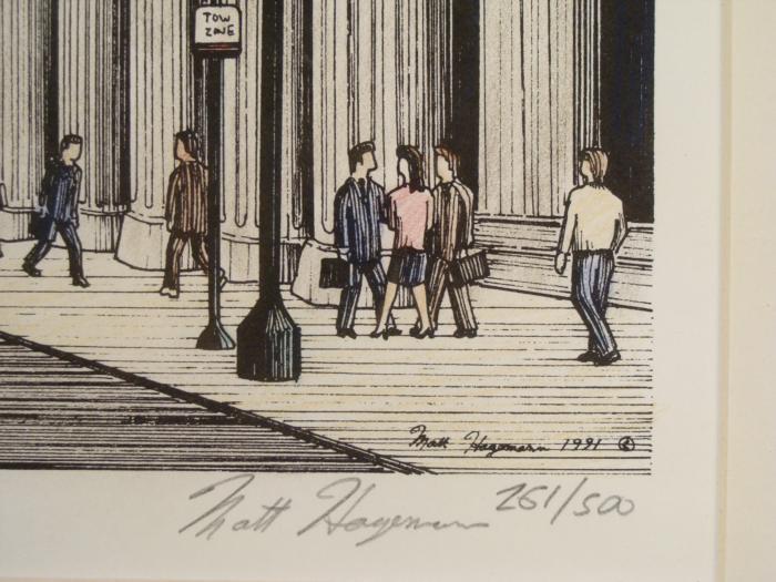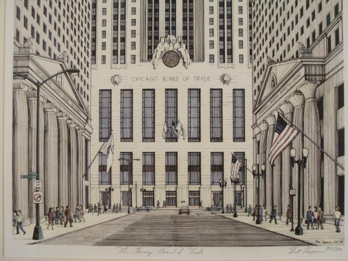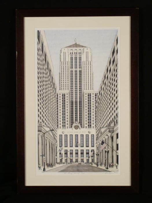 This art print shows the Chicago Board of Trade. The artist's careful attention to the architectural details makes this a fine work. Artist: Matthew HagemannMedium: Litho on paperEdition: 251/500, in pencil, lower rightYear: 1991Signature: by the artist in pencil, lower rightImage size: 13 1/2 x 23 1/2 inches Framing: Matted in off-white, in a flat dark brown wood frameFrame size: 20 1/4 x 30 1/2 inchesCondition: Very good; nick on frame, upper left; some sticker residue, can be cleaned offThis is a great print for anyone involved in trading, or anyone who loves Chicago architecture. Matthew P. Hagemann