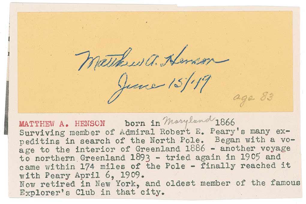 African-American explorer (1866–1955) who was a member of the first party to (possibly) reach the North Pole in 1909. Ballpoint signature, “Matthew Henson, June 15/49,” on an off-white 5.5 x 2 slip, affixed to a 6 x 4 off-white card bearing a typed biography. In fine condition, with some light skipping to portions of signature.