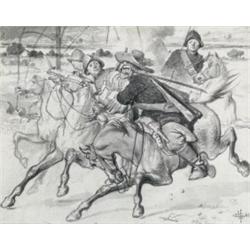 Matthew James Lawless (1837-1864) THE CAVALIER’S ESCAPE signed in monogram and dated [1861] lower right pencil and wash on paper –mounted but unframed 10 by 13cm., 4 by 5.25in. Literature: Engraved by Joseph Swain and reproduced alongside Walter Thornbury’s poem, ‘The Cavalier’s Escape’, published in Once A Week: an Illustrated Miscellany of Literature, Art, Science & Popular Information, Vol. IV, No. CIII, 15 June 1861, pp. 686-687; illustration p. 687; Walter Strickland, A Dictionary of Irish Artists Vol. II, Irish University Press.; Shannon, 1969, engraving listed p. 6 Considered by Strickland to be “one of the most brilliant and promising young artists to whom Ireland has given birth”, Matthew Lawless was a Pre-Raphaelite painter and illustrator who had a tragically brief career, dying of consumption at the age of 27. His work is consequently very rare and little known, although his large oil, The Sick Call, in the National Gallery of Ireland would be familiar to many. Born in Dublin, the son of solicitor Barry Edward Lawless of Harcourt Street, he studied art at the Langham School under Henry O’Neill RA. He began exhibiting at the RA at the age of 21, but was better known for his illustration work which was widely admired. In particular his drawings for Once a Week, such as is seen here, demonstrated according to Strickland “a genius of invention and a sense of beauty and form which ranked him as but little inferior to Millais and Sandys, and speedily obtained for him a wide reputation”. The present work was used as an illustration to Walter Thornbury’s poem of the same title. The wood engraved illustration differs slightly in that the background is more heavily wooded and a small bird was added just above the artist’s monogram. It is accompanied by a letter from Dr Mark L. Evans, Senior Curator of Paintings at the V&A Museum, confirming the title of the work.