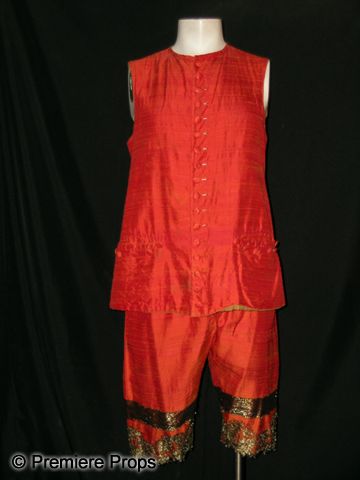 Matthew Modine's costume from the 1995 swashbuckling adventure 'Cutthroat Island,' directed by Renny Harlin. This bright orange 2 piece costume consists of a button down vest, with tassels on the reverse for fastening, and orange bermuda-sized shorts. Shorts have a button front with small tassels on back for extra fit. Gold patterned fabric adorns the area just above the knees.