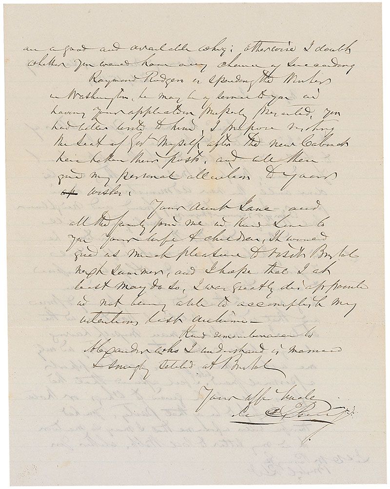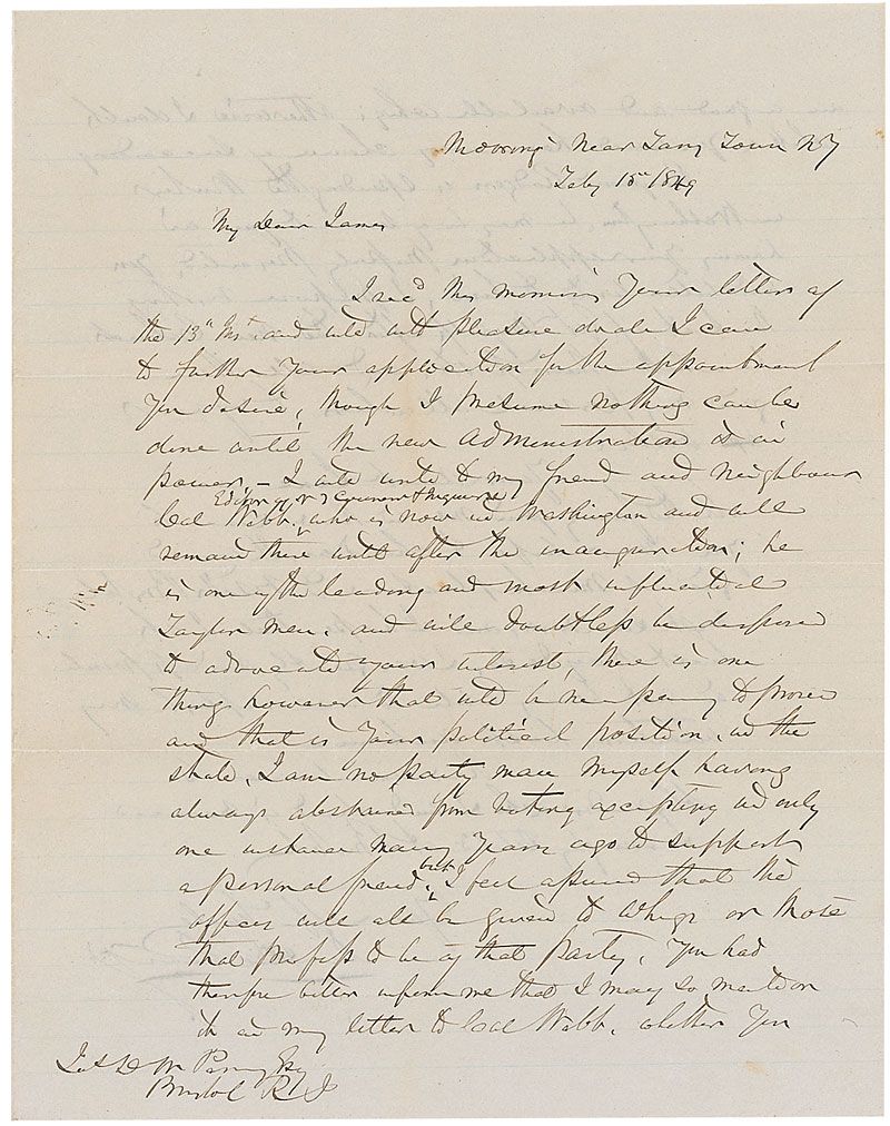 ALS signed “Your affec Uncle, M. C. Perry,” one page, lightly-lined both sides, 7.75 x 10, February 15, 1849. Letter to his nephew, James DeWolf Perry. In part: “I will write to my friend and neighbor Col. Webb, Editor of NY Courier & Inquirer, who is now in Washington and will remain there until after the inauguration…I feel assured that the offices will all be given to Whigs…You had therefore better inform me that I may so mention it in my letter to Col. Webb, whether you are a good and available Whig…I propose writing the Seat of Govt myself, after the new Cabinet have taken their posts, and will then give my personal attention to your wishes.” Accompanied by a retained draft ALS from James Perry to his uncle, with a second draft letter on the reverse to Rhode Island senator Albert Greene, both letters requesting help getting an appointment. In fine condition, with intersecting folds, one through a single letter of signature.