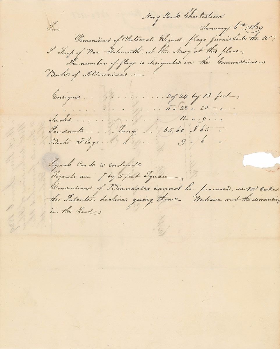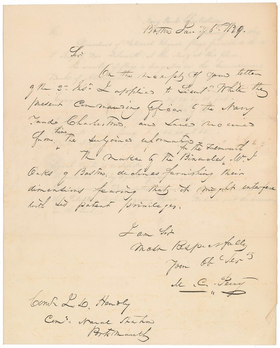 ALS signed “M. C. Perry,” one page, 8 x 9.75, January 6, 1829. Letter to Captain John D. Henley of the Portsmouth Naval Station, in full: “On the receipt of your letter of the 2nd Inst. I applied to Lieut. White the present Commanding Officer of the Navy Yard Charlestown and have received from him the subjoined information. The maker of the Binacles [sic] for the Falmouth, W. L. Oakes of Boston, declines furnishing their dimensions fearing that it might interfere with his patent privileges.” The information he references is penned on the second integral page in another hand and provides the dimensions of flags used aboard their ships. Intersecting folds, a missing lower right corner tip, show-through from docketing to second integral page, otherwise fine condition.