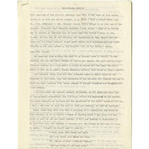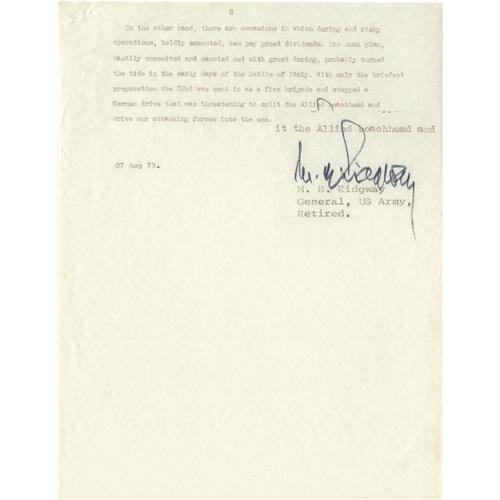 <B>General Matthew B. Ridgeway, WWII Commander of the 82nd Airborne Division, Typed Manuscript Signed</B></I> " <I>M.B. Ridgeway</B></I>". Eight typed pages, 8.5" x 11", August 7, 1975. A wonderful content letter in which Ridgeway gives his personal account of events surrounding the ill-conceived airborne drop known as Operation Giant II. The original plan called for Ridgeway's 82nd Airborne to be dropped near Rome and rely upon Italian troops to switch sides and fight with American forces against the Germans. Ridgeway describes his travails in convincing higher-ups to abort the plan. The operation was stopped at the very last minute- even as the aircraft were loaded with Ridgeway's men and preparing for take off. Ridgeway writes in part: "…I truly believed the plan would result in the sacrifice of my division…" and describes his part in convincing his superiors to abort the mission thusly: "…the source of most humble pride to me will not be accomplishments in battle, but the fact that I was guided to make the decision to oppose this thing…" Matthew Ridgeway, (1895-1993) in addition to being commander of the 82nd Airborne Division in WWII, had a distinguished post-war career culminating as President Eisenhower's Chief of Staff of the U.S. Army. This is an important historical document for students of World War II history. The document is in fine condition with a staple in the upper left corner.<BR><BR><b>Shipping:</b> Small Flat (<a target="_blank" href="http://www.heritageauctions.com/common/shipping.php">view shipping information</a>)