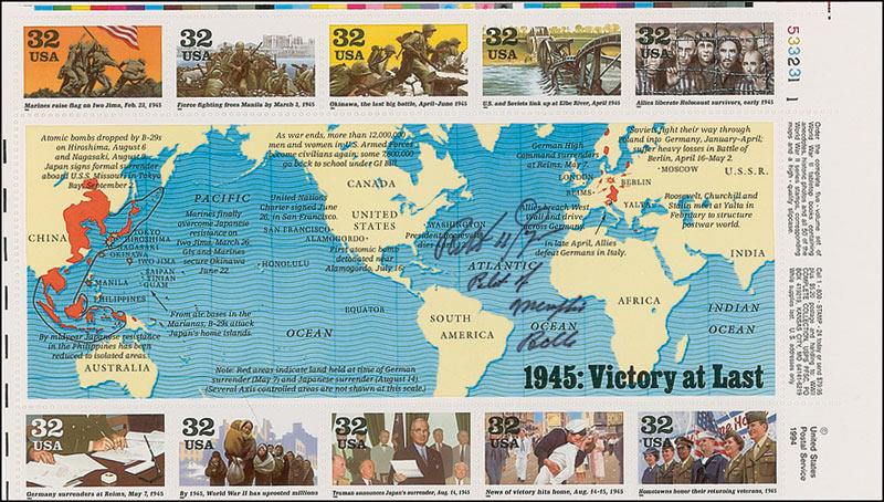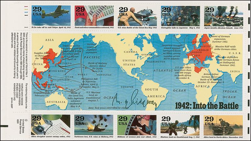Two World War II commemorative stamp sheets, each measuring 9 x 5.25, one entitled “1942: Into the Battle,” signed by Ridgeway; and one entitled “1945: Victory at Last,” signed by Robert Morgan, adding “Pilot of Memphis Belle.” In fine condition, with a slightly fuzzy appearance to Morgan’s signature.