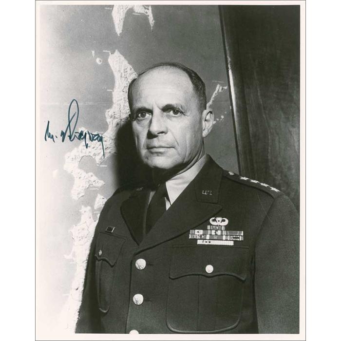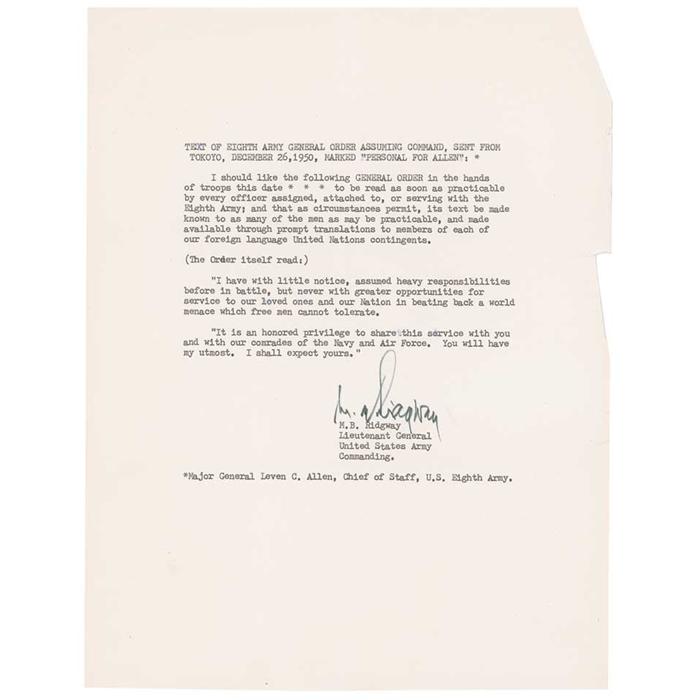 Two items: glossy 8 x 10 photo of Ridgeway posing in front of a map, signed in black felt tip; and a souvenir typescript, one page, 8.5 x 11, of the Eighth Army General Order assuming command of the Army, signed at the conclusion in black felt tip, “M. B. Ridgeway.” In fine condition, with edge creasing and tears to right side of typescript. RRAuction COA.