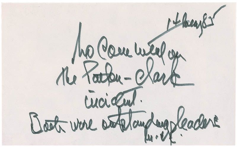 ANS signed “MR,” one page, 5 x 2.75, January 14, 1985. In full: “No comment on the Patton-Clark incident. Both were outstanding leaders.” Card is affixed to an identical size mailing label In fine condition.