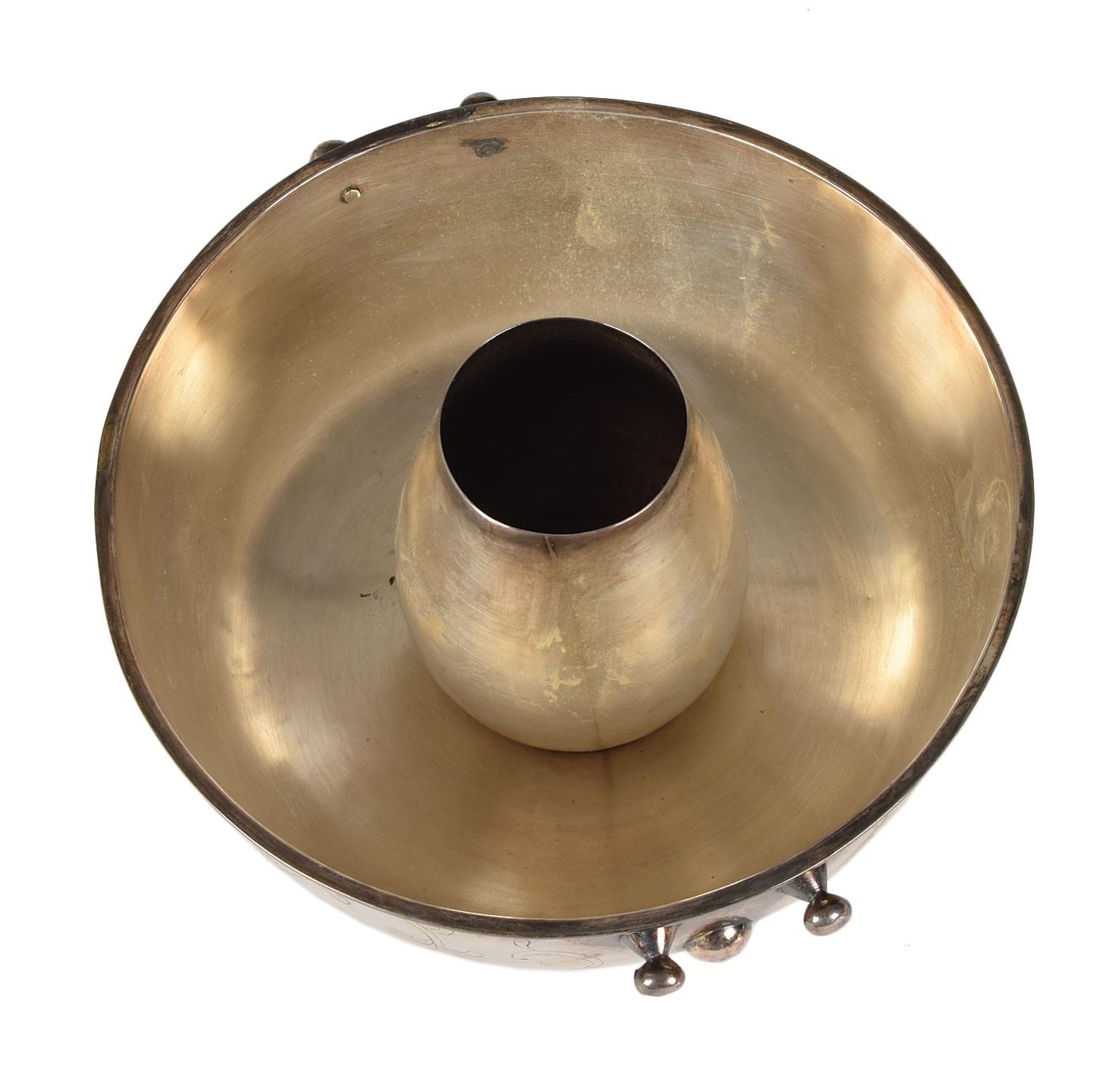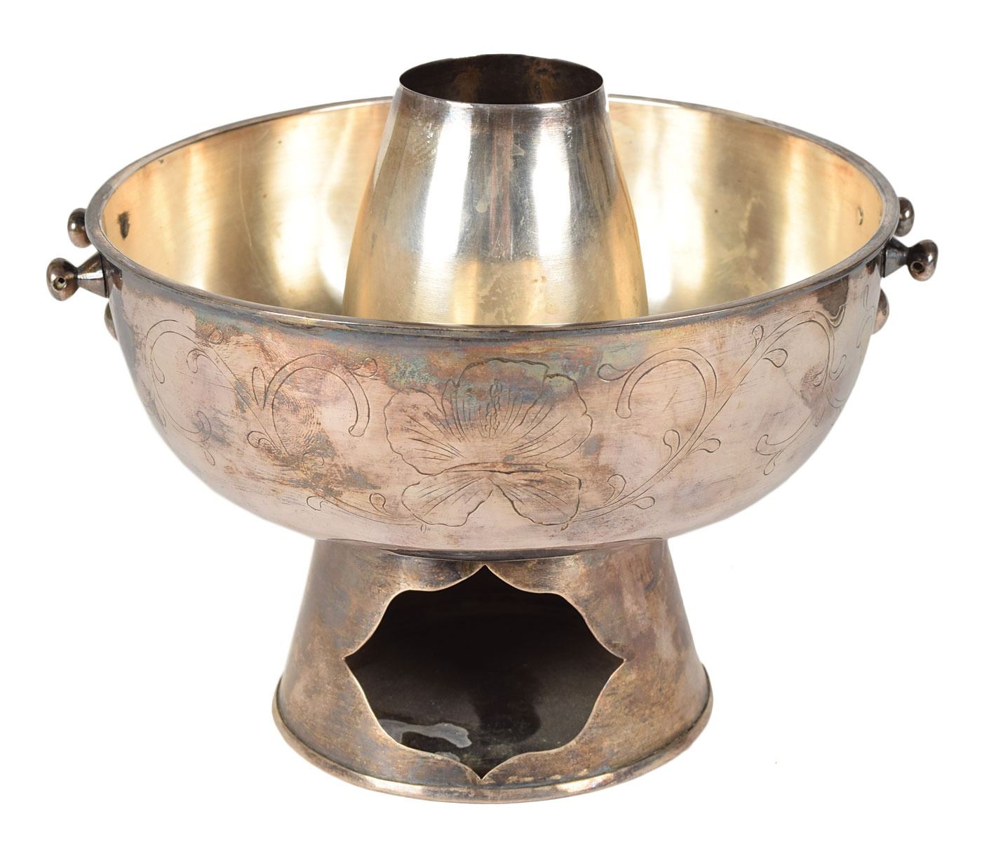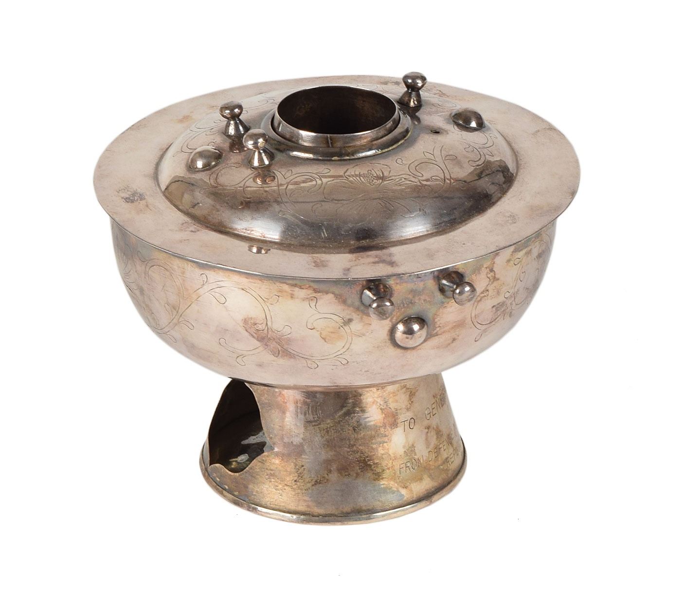 Sterling silver Sinseollo dish presented to General Matthew Ridgway by the Korean Minister of Defense. The traditional Korean dish stands 5.5? tall and 7? in diameter, and is engraved around the base with four stars, and the inscription, “To General & Mrs. M. B. Ridgway, From Defense Minister & Mrs. Ki Poong Lee, Republic of Korea.” The bottom of the dish bears the Korean hallmark, and the bowl and lid are engraved with delicate floral designs. The handles and one knob to lid are no longer present. In fine condition.