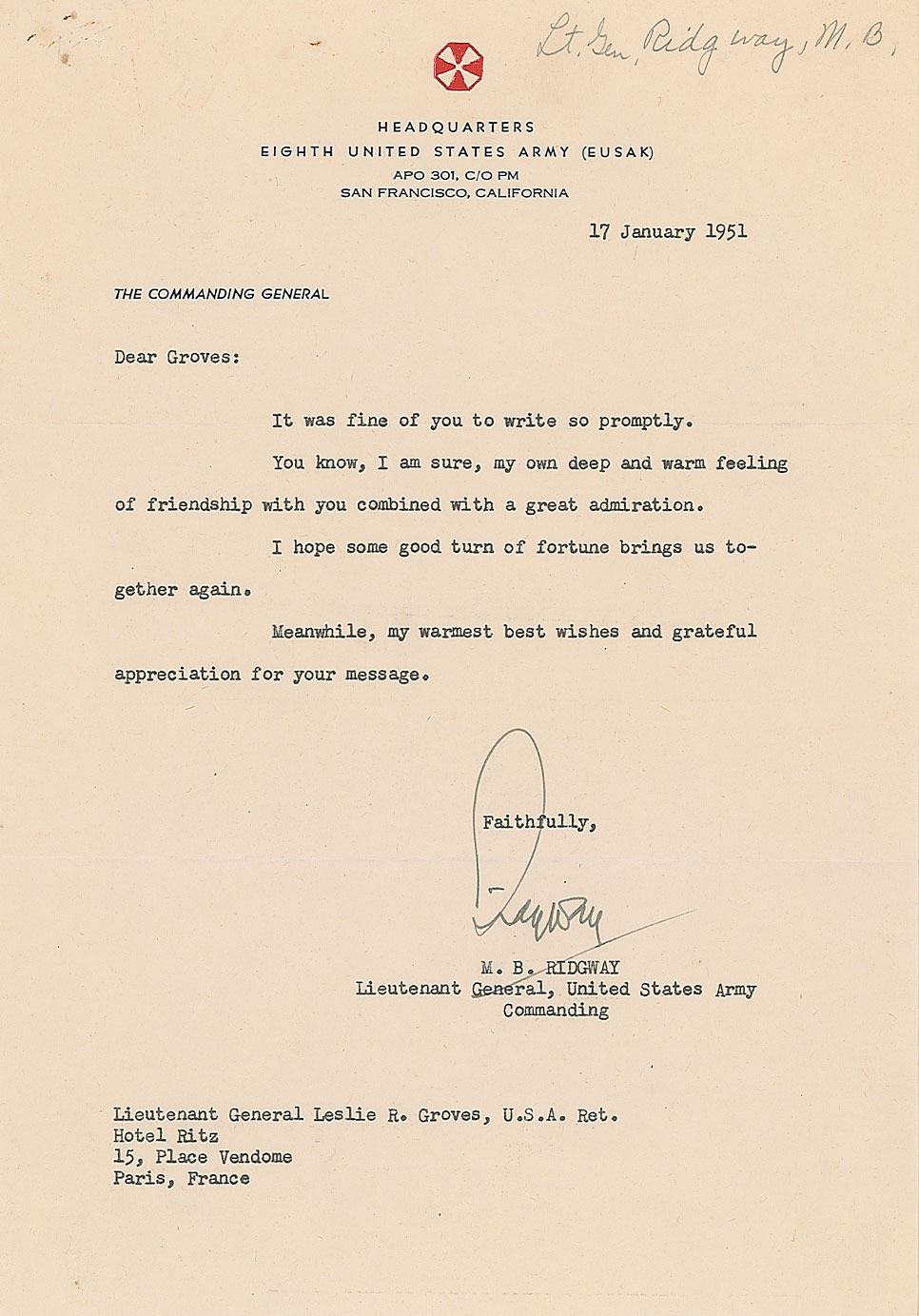 TLS signed “Ridgway,” one page, 7.25 x 10.5, Headquarters, Eighth United States Army (EUSAK) letterhead, January 17, 1951. Letter to Lt. Gen. Leslie R. Groves, who had famously overseen the Manhattan Project during World War II. In full: "It was fine of you to write so promptly. You know, I am sure, my own deep and warm feeling of friendship with you combined with a great admiration. I hope some good turn of fortune brings us together again. Meanwhile my warmest best wishes and grateful appreciation for your message." In fine condition, with staple holes to the upper left corner.