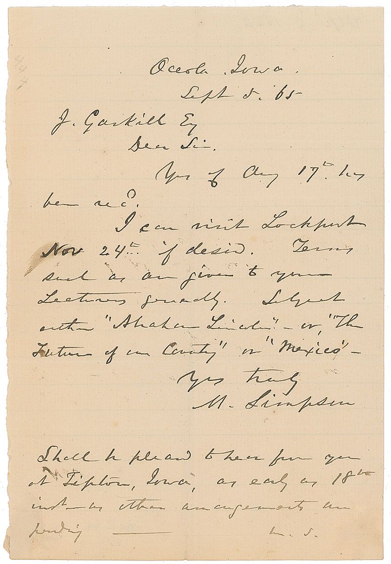 ALS signed “M. Simpson,” one page, lightly-lined, 4.75 x 7, September 15, 1865. Letter to a gentleman. In part: “Terms such as are given to your lecturers generally. Subject either ‘Abraham Lincoln’—or, ‘The Future of our Country’ or ‘Mexico.’” Intersecti
