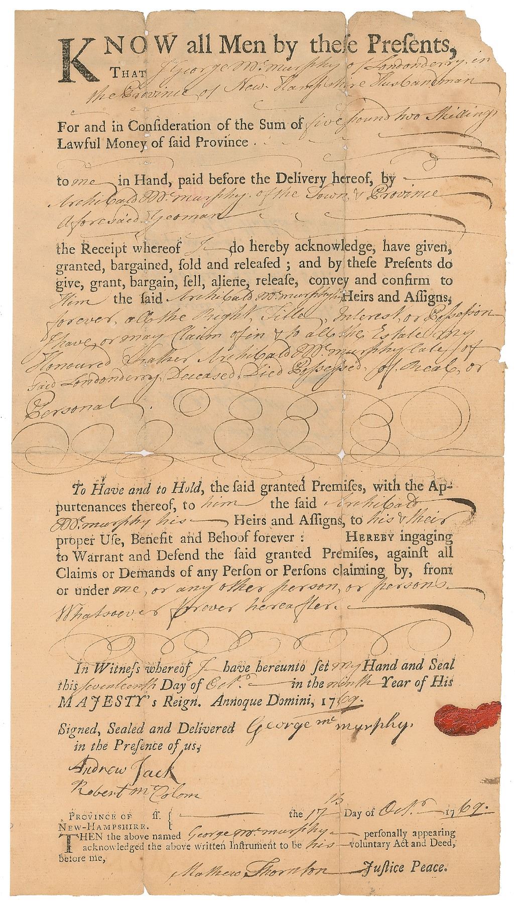 Scarce partly-printed DS, signed “Mathew Thornton,” one page, 6.75 x 12.25, October 17, 1769. As justice of the peace, Thornton certifies a deed for the sale of a plot of land by George McMurphy to Archibald McMurphy. In very good to fine condition, with splitting to the intersecting folds, partially repaired with tape on the reverse.