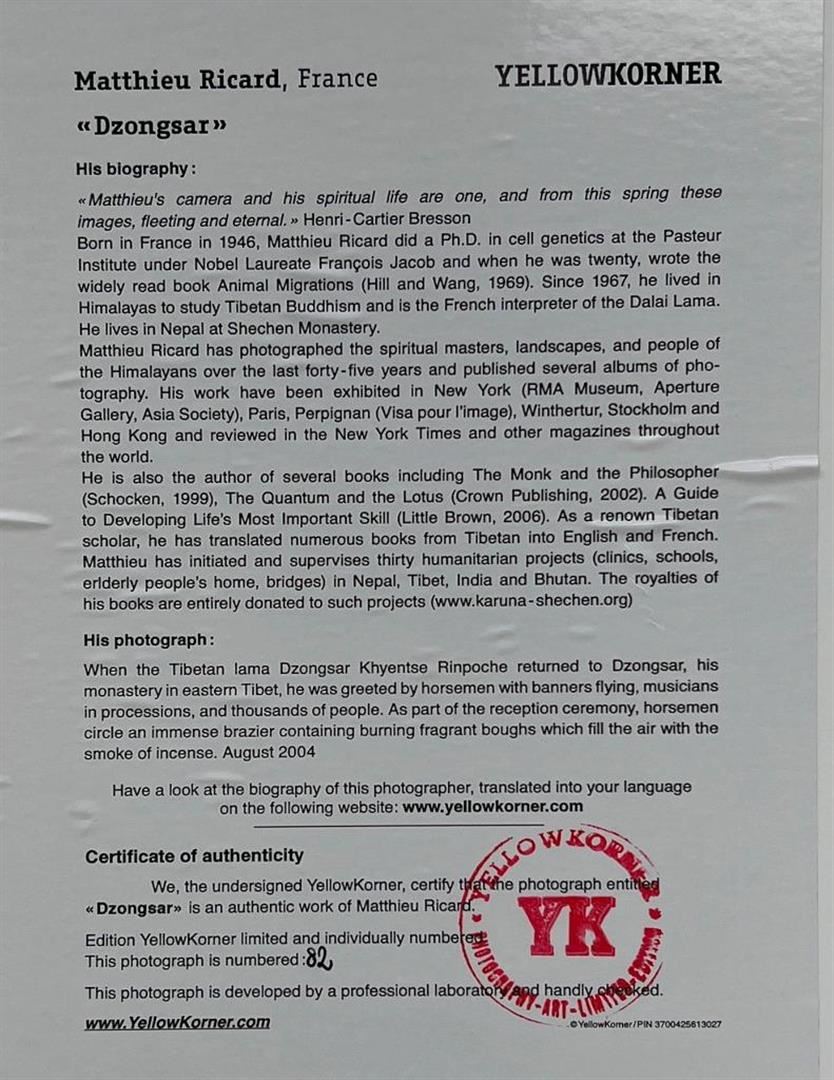 Matthieu Ricard France Dzongsar YellowKorner Certified Photograph. Certificate of Authenticity from YellowKorner affixed to the back. Matted Dimensions 16"x20". Protected with Clear Mylar Sleeve.