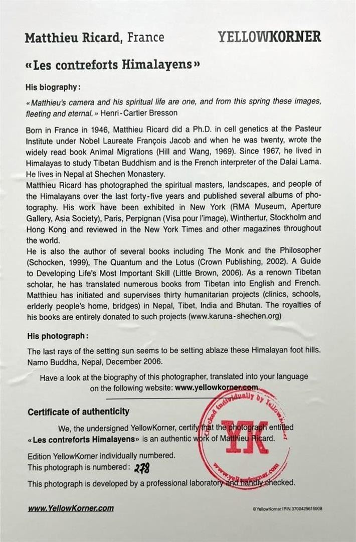 Matthieu Ricard France Les Contreforts Himalayens YellowKorner Certified Photograph. Certificate of Authenticity from YellowKorner affixed to the back. Matted Dimensions 16"x20". Protected with Clear Mylar Sleeve.