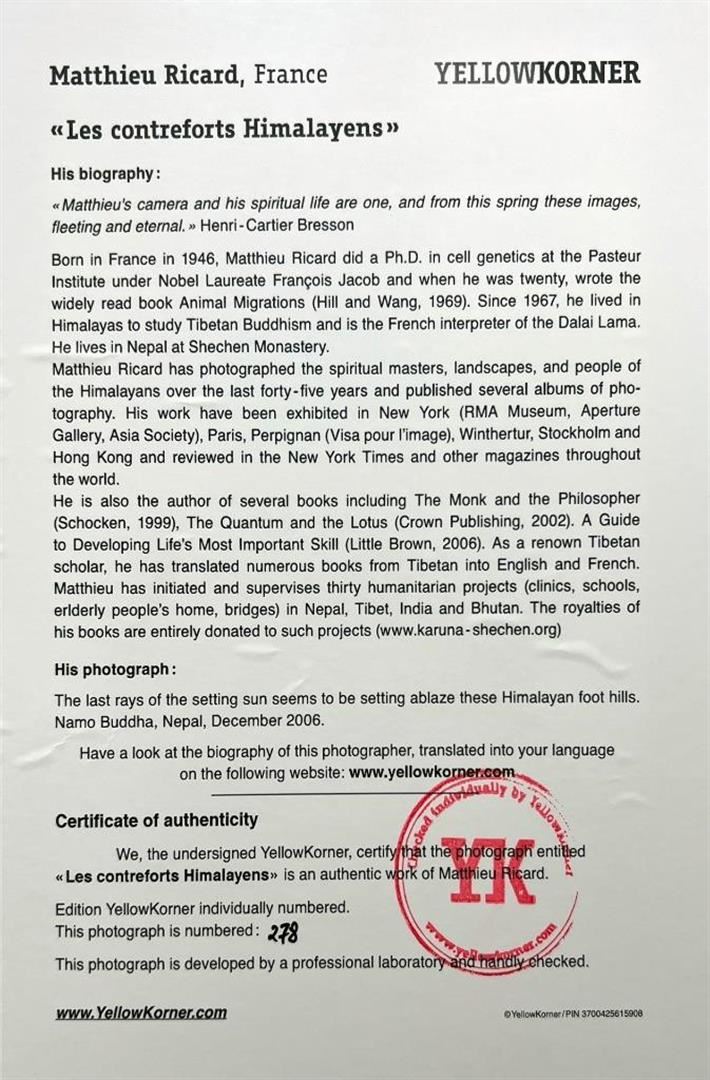 Matthieu Ricard France Les Contreforts Himalayens YellowKorner Certified Photograph. Certificate of Authenticity from YellowKorner affixed to the back. Matted Dimensions 16"x20". Protected with Clear Mylar Sleeve.