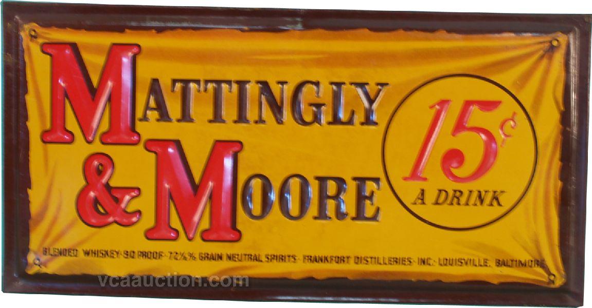 Mattingly & Moore Whiskey "15 Cent A Drink" Embossed Tin Sign w/ cardboard easel back - 14" x 7"