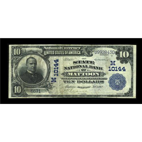 <B>Mattoon, IL</B></I> - $10 1902 Plain Back Fr. 628 <B>The State NB</B></I> Ch. # (M)10144<BR>This attractive <B>Very Fine</B></I> saw some time in the Midwest channels of commerce. One signature remains and the overprint is deeply printed.<BR><I>From The Lincoln Collection</B></I><BR><BR><b>Shipping:</b> Coins & Currency (<a target="_blank" href="http://www.heritageauctions.com/common/shipping.php">view shipping information</a>)
