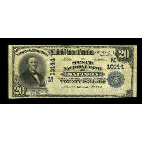 <B>Mattoon, IL</B></I> - $20 1902 Plain Back Fr. 654 <B>The State NB</B></I> Ch. # (M)10144<BR>Ten large size only for this Coles County issue are recorded. <B>Very Good</B></I> with stamped signatures still visible.<BR><I>From The Lincoln Collection</B></I><BR><BR><b>Shipping:</b> Coins & Currency (<a target="_blank" href="http://www.heritageauctions.com/common/shipping.php">view shipping information</a>)