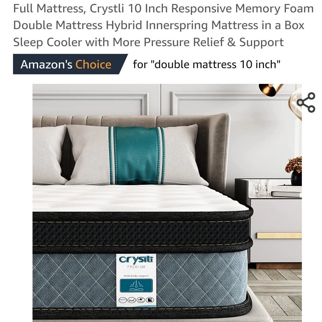Full-size 10-inch mattress combining memory foam and innersprings for cooling comfort, new in a box.