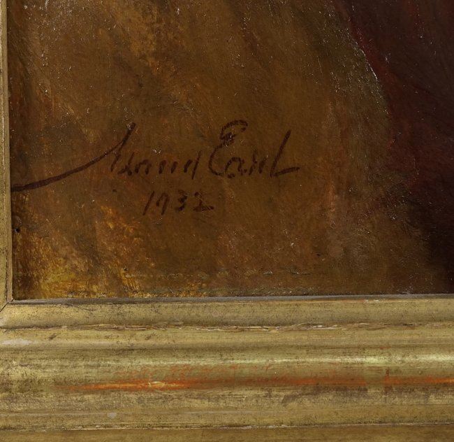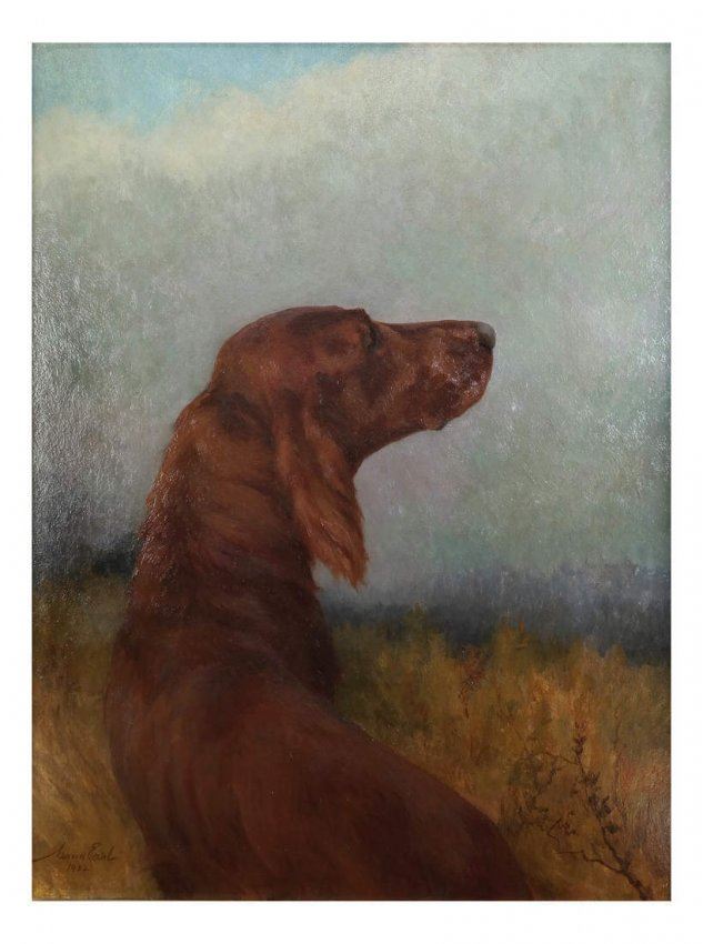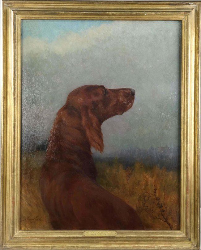 Outdoor depiction of an Irish setter with head turned in half profile pose. Signed bottom left, "Maud Earl / 1932". Plaque: "PH Terence of the Cloisters". [Art (sight): 25 5/8" x 19 1/2"; Frame: 30 1/2" x 24 1/2"]. In good condition.