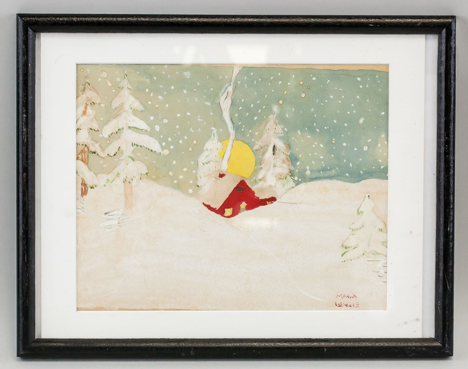 Mixed media on paper, framed. Featuring idyllic winter scene of a red cottage among fields of snow. A large yellow moon shines brightly behind the cottage. Signed "Maud Lewis" in the bottom right corner. Attributed to Maud Lewis (1903-1970, Canadian). 19 x 24 cm (7.75 x 9.75 in), Frame: 28 x 35 cm (11 x 13.5 in). Provenance: This lot carries limited provenance from a Toronto estate