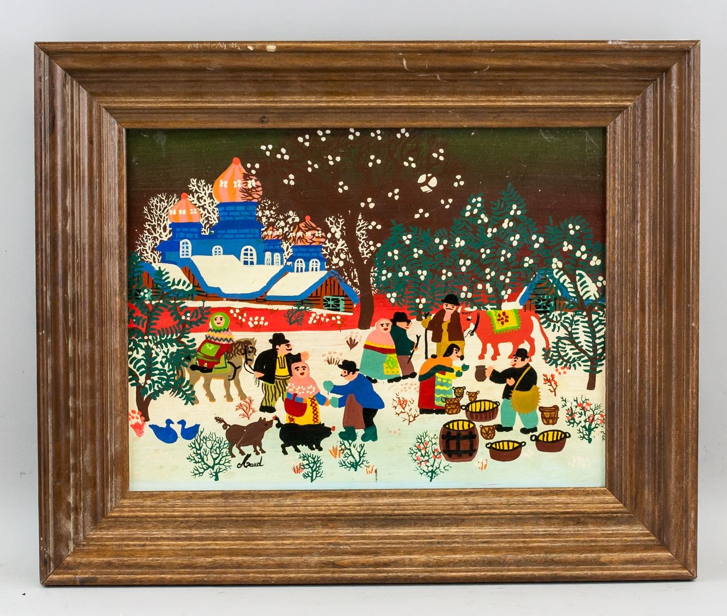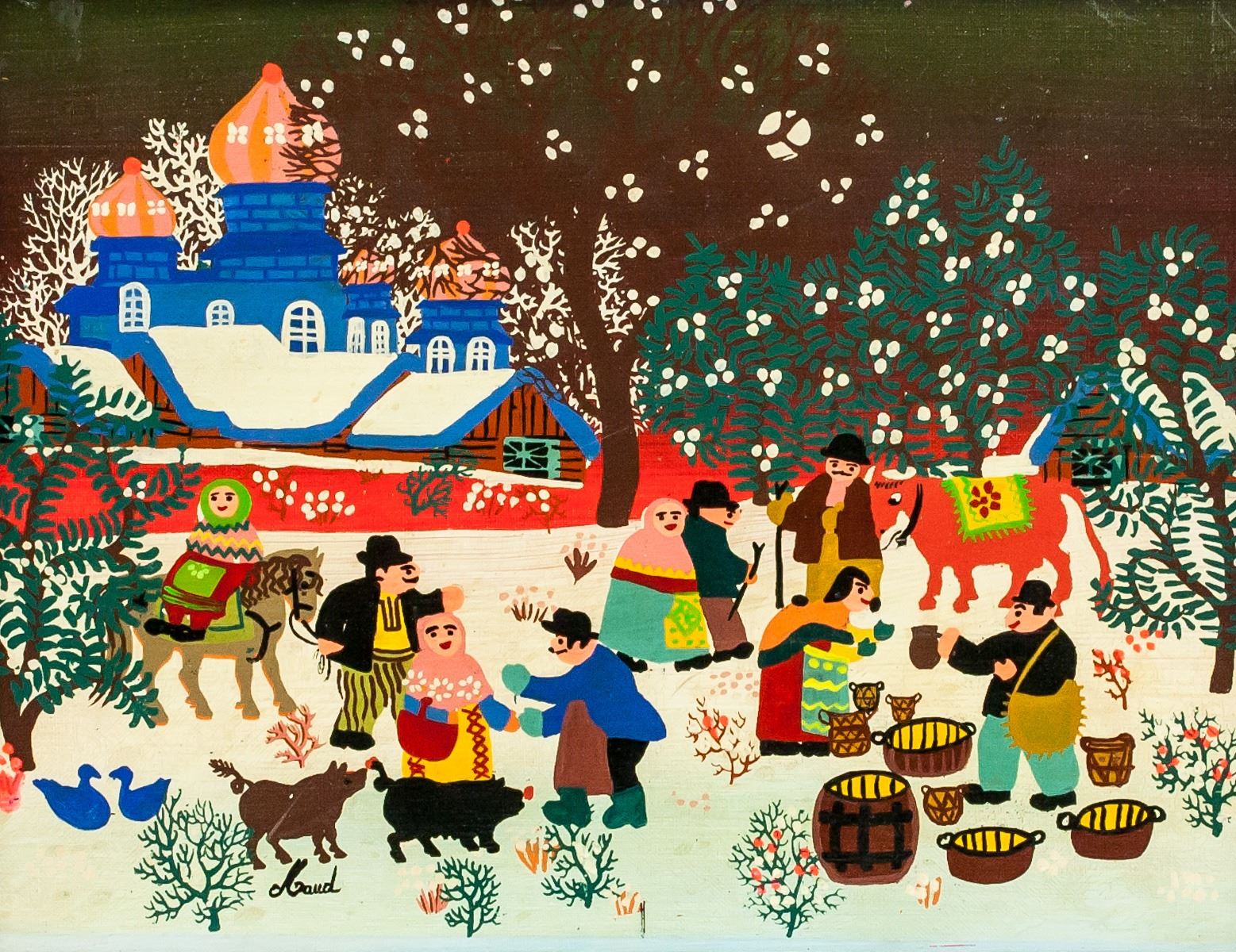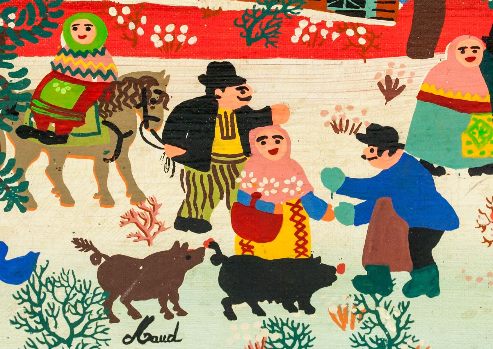 Oil on canvas, framed. Featuring celebratory snow scene. Signed Maud lower left hand corner. Attributed to Maud Lewis (1903-1970, Canadian). 24 x 33 cm (9.5 x 13 in). Frame: 35 x 42.5 cm (13.75 x 16.75 in). PROVENANCE: Southern Ontario estate