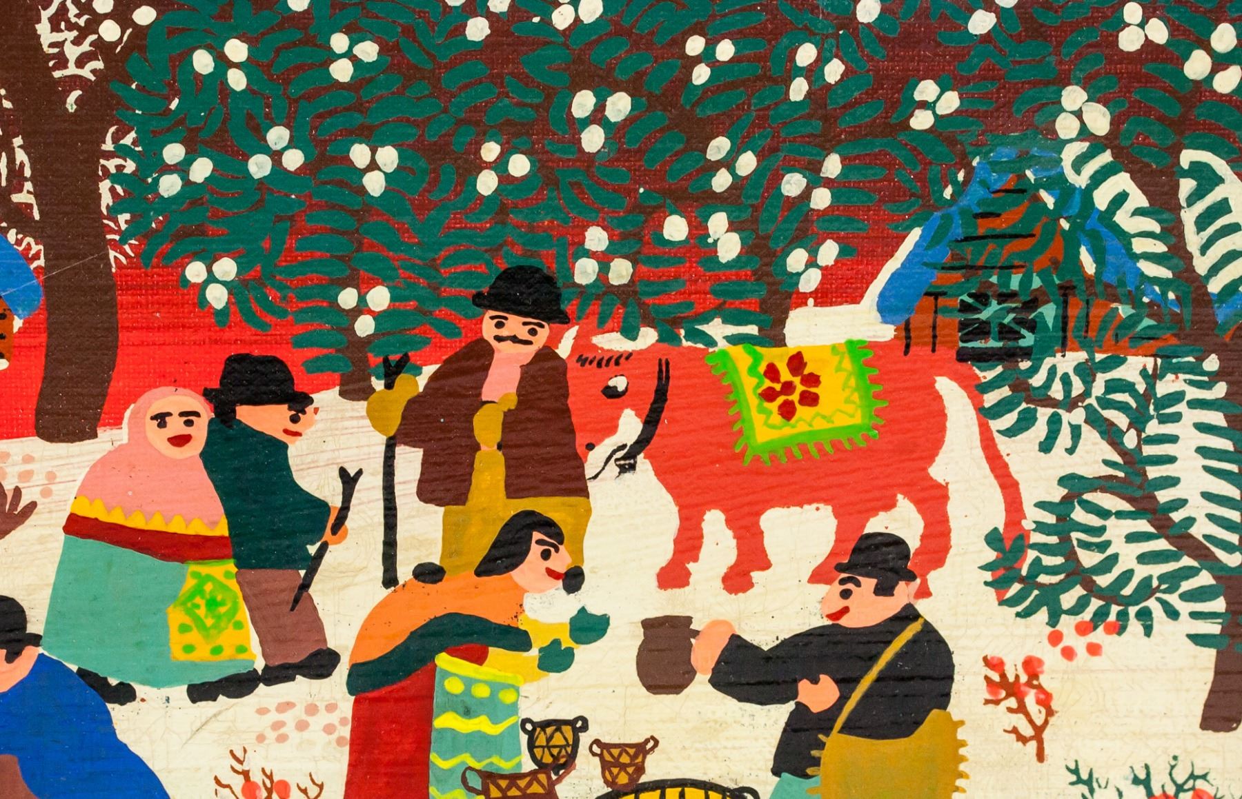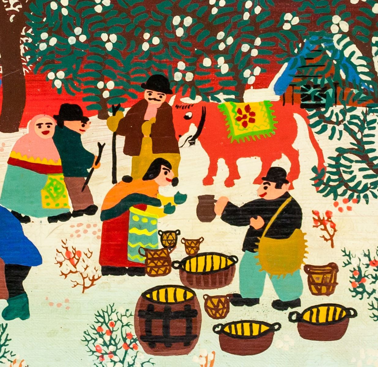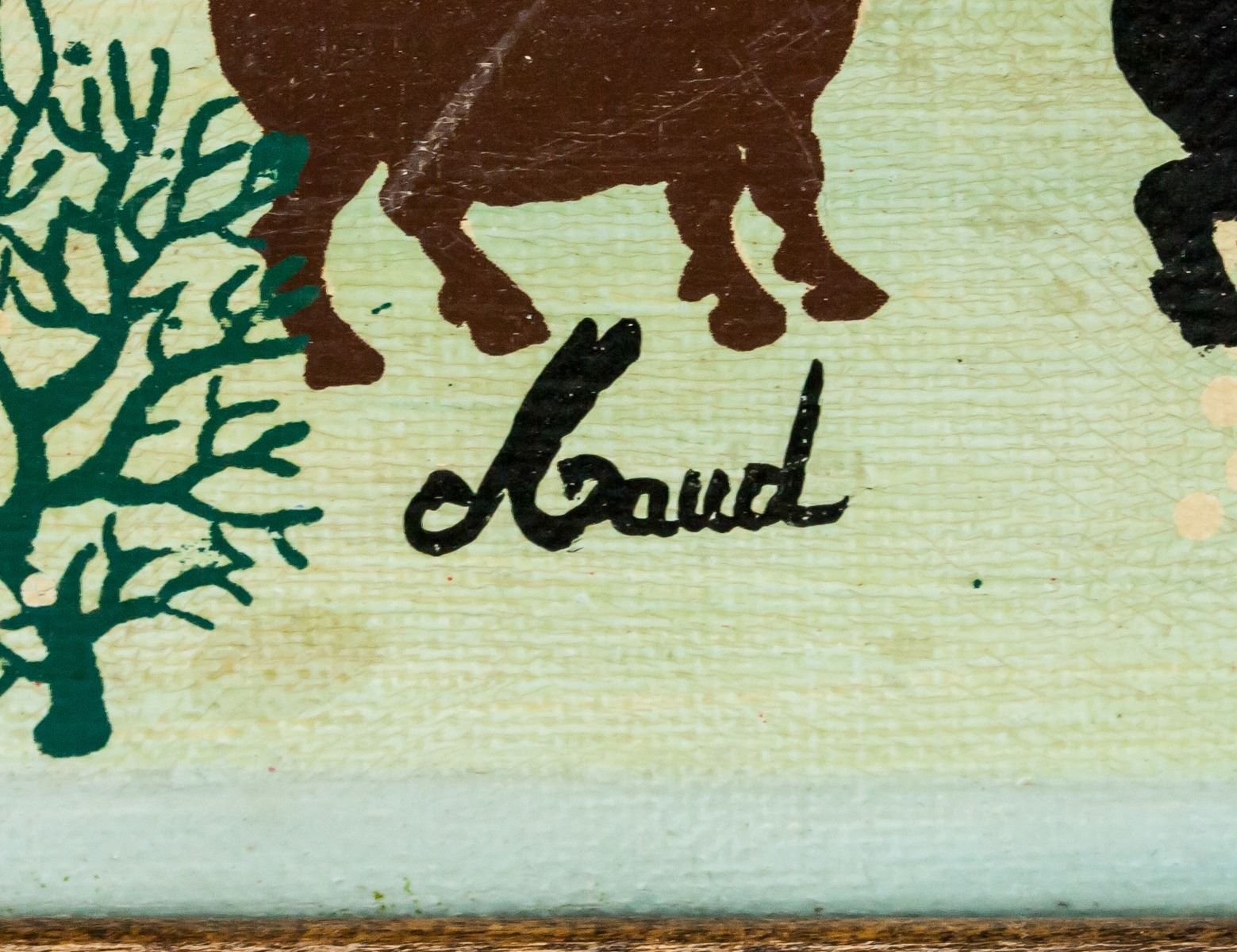 Oil on canvas, framed. Featuring celebratory snow scene. Signed Maud lower left hand corner. Attributed to Maud Lewis (1903-1970, Canadian). 24 x 33 cm (9.5 x 13 in). Frame: 35 x 42.5 cm (13.75 x 16.75 in). PROVENANCE: Southern Ontario estate