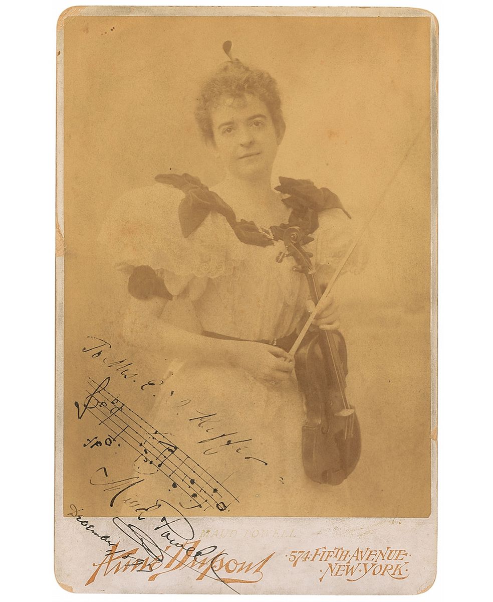 Internationally acclaimed American violinist (1867–1920). Original 4.25 x 6.5 cabinet photo of Powell holding her violin by Dupont of New York, signed and inscribed in black ink “To Mrs. E. I. Kiffer, Maud Powell, December 1897,” with Powell adding a two-bar AMQS under her signature. A few edge dings and chips, scattered light soiling and rubbing to image, and some irregular ink adhesion to signature and quote, otherwise fine condition.