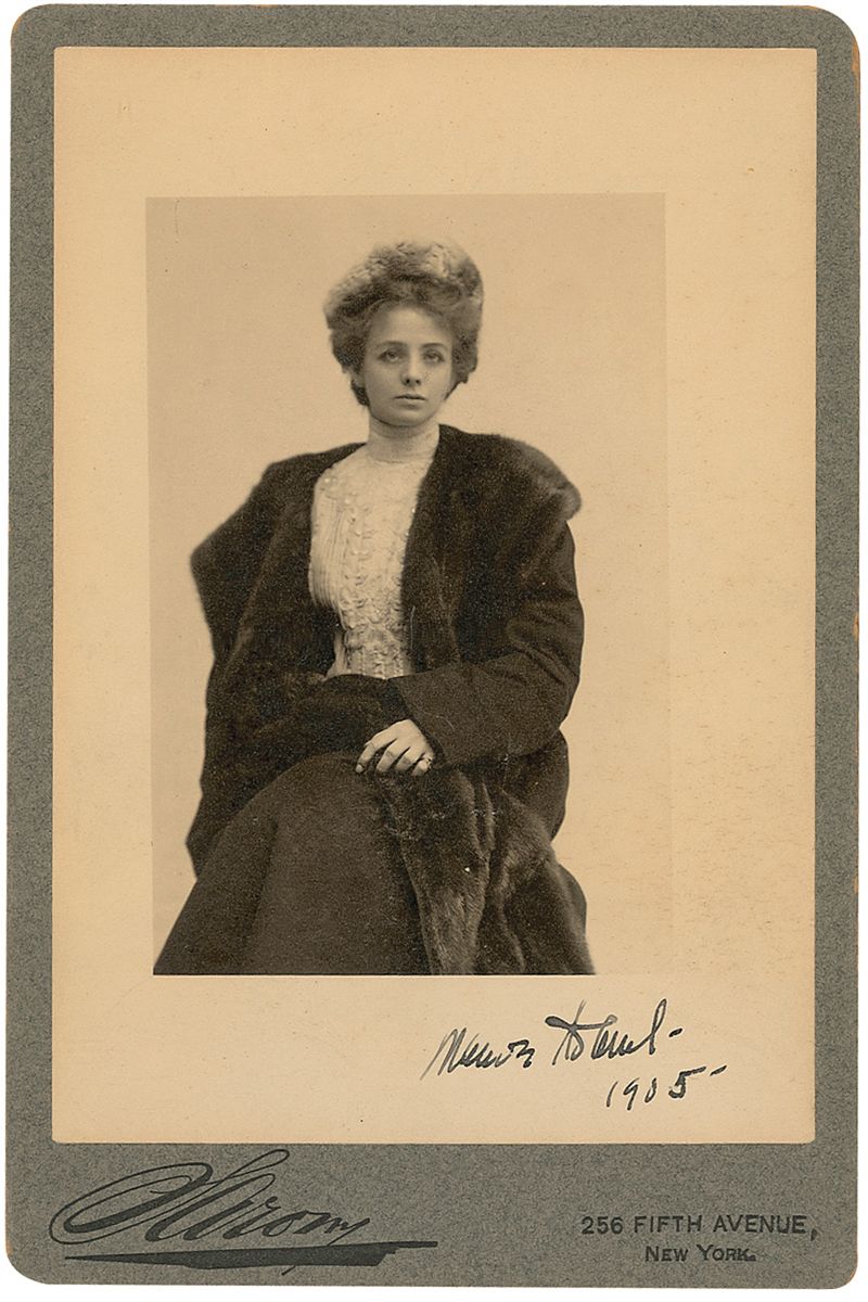 Stage actress (1872-1953) who achieved her greatest success as Peter Pan. Vintage 4.25 x 6.5 cabinet photo by Sarony, signed on the image in fountain pen, “Maude Adams 1905.” In fine condition, with a light crease to top edge and a uniform shade of trivial toning to borders.