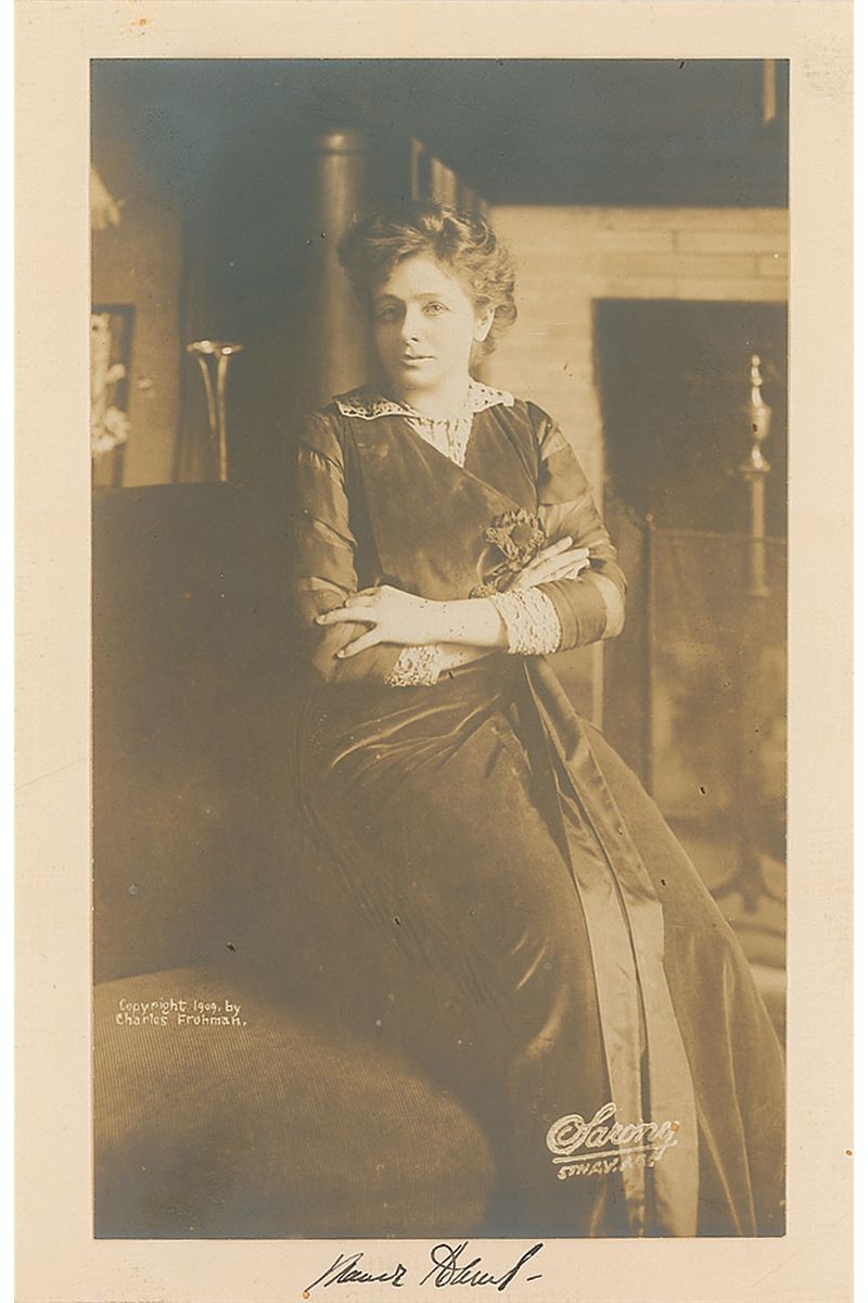 Stage actress (1872-1953) who achieved her greatest success as Peter Pan. Vintage matte-finish 3.25 x 5.5 Sarony photo, affixed to a 4 x 6 mount, signed on the mount in black ink. In fine condition, with bottom portion of photo detached from mount and some scattered light silvering to darker areas of edges.