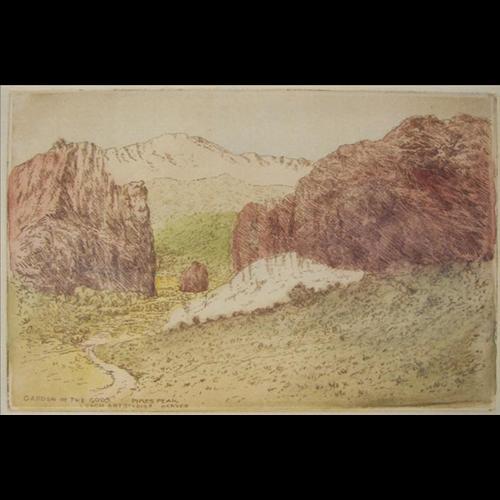 Maude Leach (1870-1927) (Colorado) Colored Etching, "Garden of the Gods & Pikes Peak", image size 4" x 6", signed in the plate