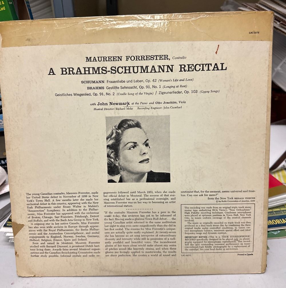 The cover is hand-signed by Maureen Forrester. It exhibits noticeable wear, including a tear on the top right corner, general edge wear, and significant yellowing and staining on the back.