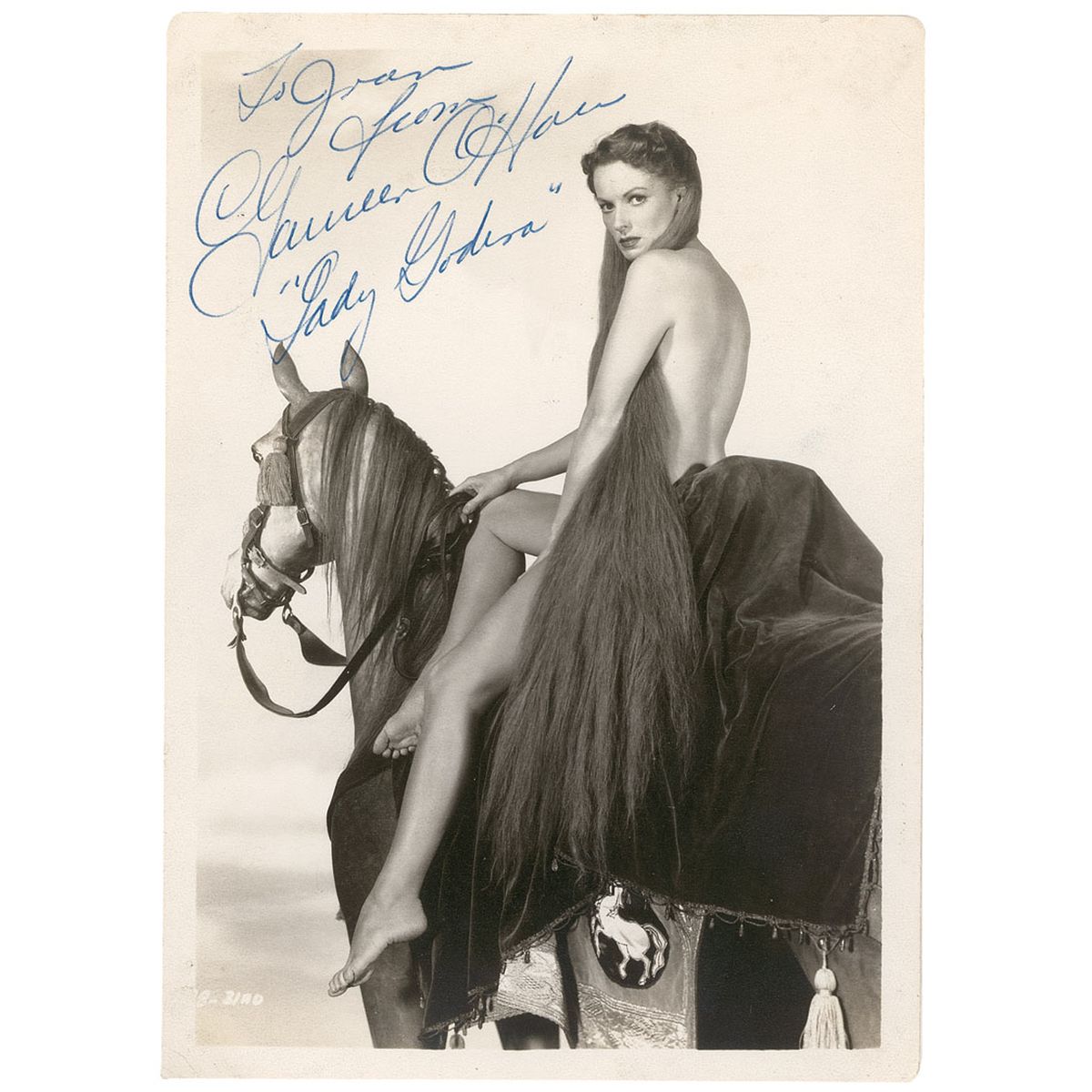 Matte-finish 5 x 7 photo of a nude O’Hara on horseback as Lady Godiva, signed and inscribed in blue ballpoint, “To Joan, from Maureen O’Hara, ‘Lady Godiva.’” Some mild corner creasing, light silvering to the darker areas of the image, and mounting remnants to the reverse, otherwise fine condition.