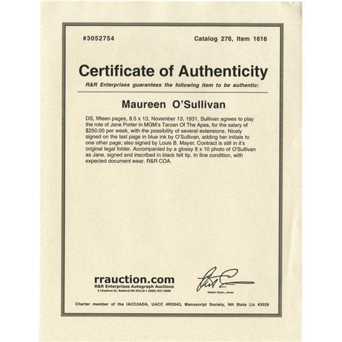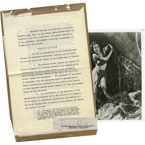 <B>Maureen O'Sullivan Signed "Tarzan" Contract.</B></I> A 15-page contract between MGM and Maureen O'Sullivan dated November 13, 1931, engaging the actress for the role of Jane Parker in <I>Tarzan the Ape Man,</B></I> signed by O'Sullivan and Louis B. Mayer on the last page. The contract paid O'Sullivan $250 a week for several weeks, with the possibility of several extensions (the actress appeared in a total of six Tarzan movies during her career). The contract is in Fine to Very Fine condition with mild tanning and some overall wear and tear, and is still in its original legal folder (from which the fist page has detached). Also included are two b&w 8" x 10" glossies of O'Sullivan as Jane, one of which is signed in black ink. Both in Excellent condition. <I>Accompanied by LOA from PSA/DNA.</B></I><BR><BR><b>Shipping:</b> Flat Material, Small (<a target="_blank" href="http://www.heritageauctions.com/common/shipping.php">view shipping information</a>)