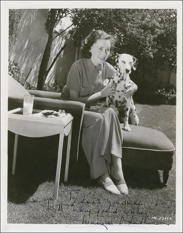 Vintage pearl-finish 8 x 10 double weight photo of the actress sitting outside with her dalmatian, signed and inscribed in-person in fountain pen “To Saul Goodman, with many good wishes, Maureen O’Sullivan.” In fine condition. Saul Goodman Collection.