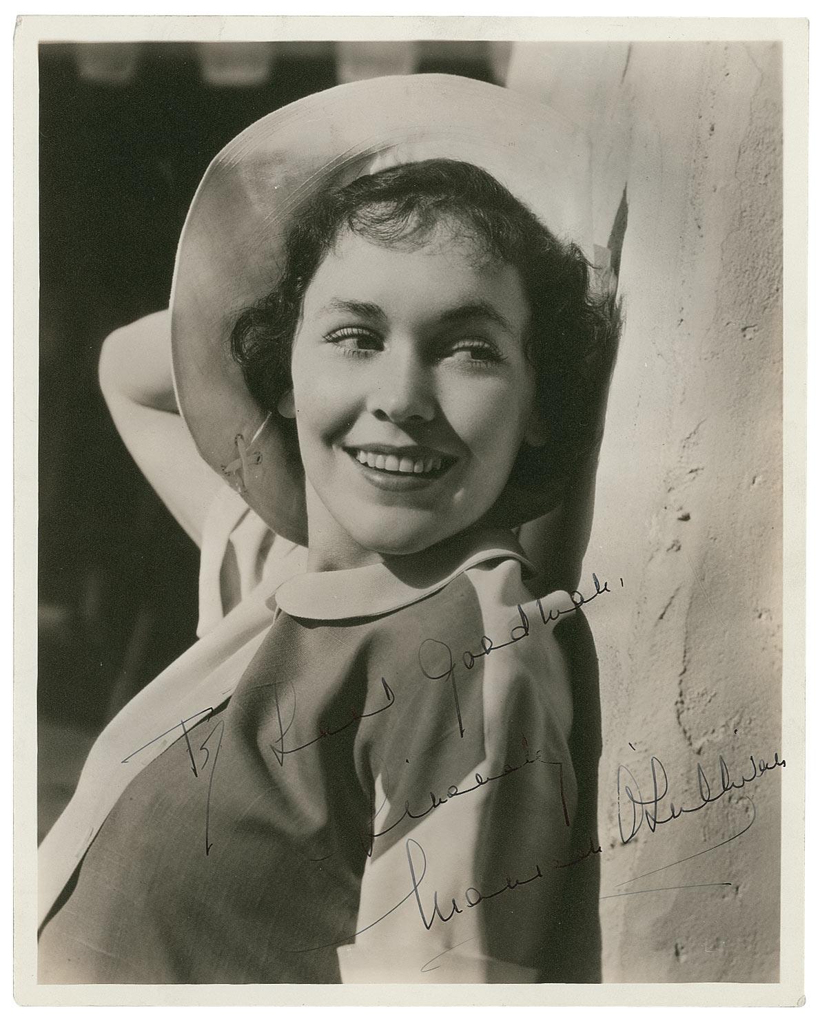 Vintage matte-finish 8 x 10 photo of a young O’Sullivan leaning against a wall, signed and inscribed in-person in fountain pen “To Saul Goodman, Sincerely, Maureen O’Sullivan.” In fine condition. Saul Goodman Collection.