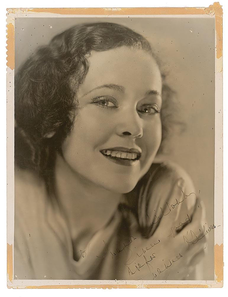 Vintage semi-gloss-finish 10 x 13 close-up photo, signed and inscribed in fountain pen, “To Manon Willobby, Sincere good wishes, Maureen O’Sullivan.” Scattered surface dings and marks, tack holes, paper loss to corners, mounting remnants along the edges and surface spotting, otherwise very good condition.