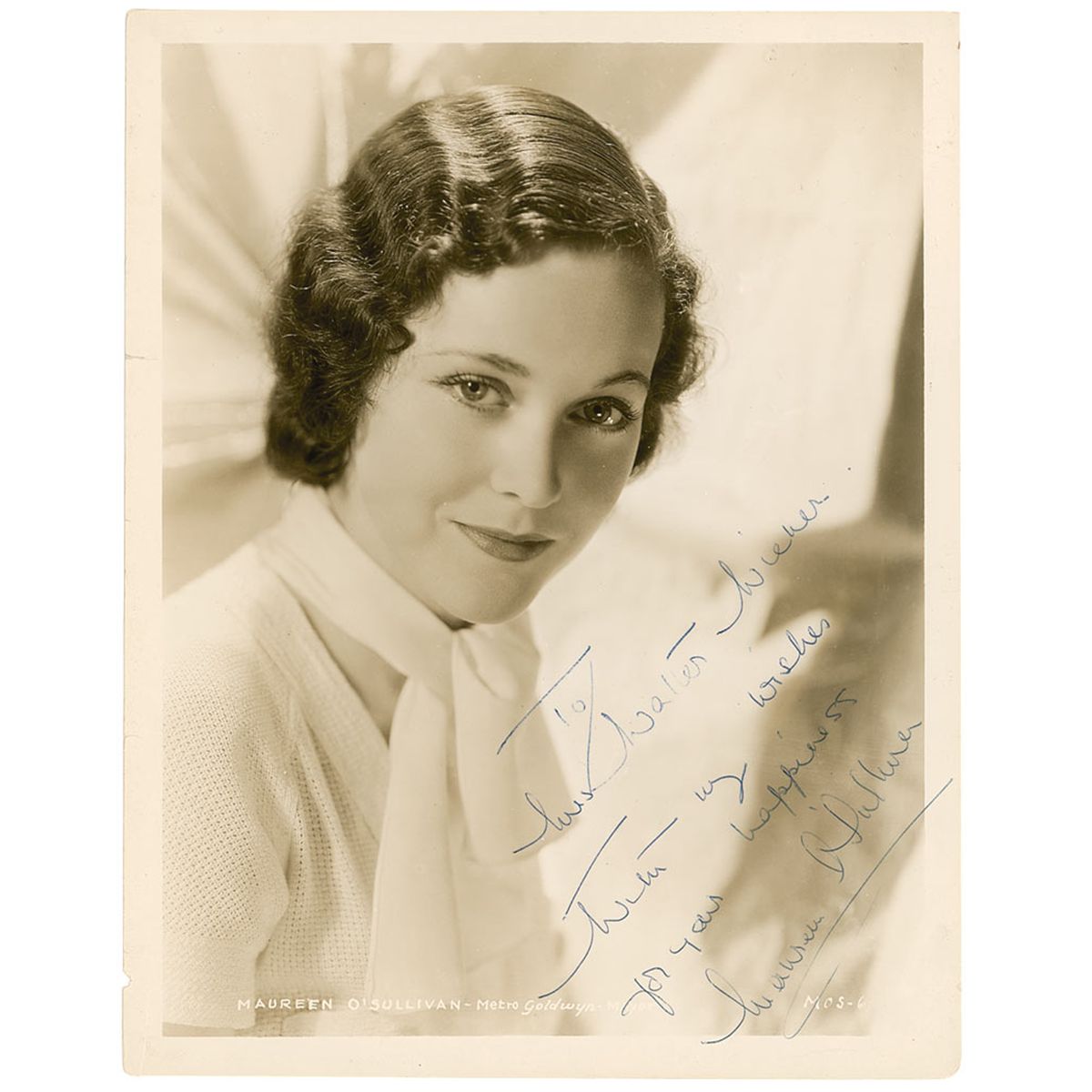 Vintage glossy 8 x 10 MGM publicity photo, signed and inscribed in blue ballpoint “To Mrs. Walter Wiener, With my wishes for your happiness, Maureen O’Sullivan.” Scattered light creases and surface marks, some light spotting to finish, and a couple of dings to left edge, otherwise fine condition.