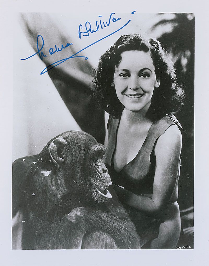 Glossy 8 x 10 photo of O’Sullivan as Jane from the Tarzan posing alongside ‘Cheeta’ the chimpanzee, signed at the top in blue felt tip. In very fine condition.