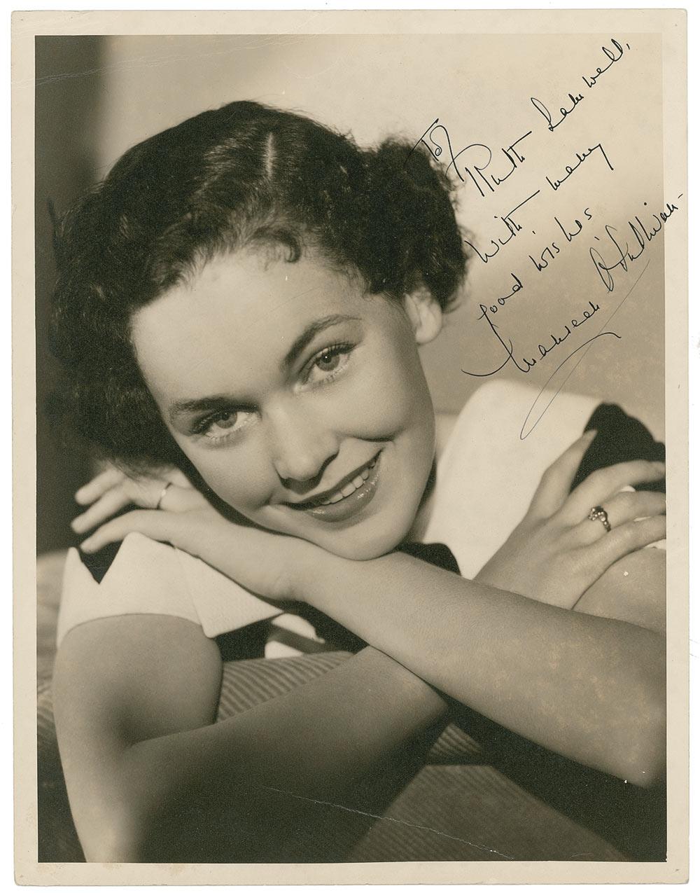 Vintage matte-finish 10 x 13 photo of the actress resting her head on her arm, signed and inscribed in fountain pen “To Ruth Lakewell, with many good wishes, Maureen O’Sullivan.” Small tack holes to each corner tip, a diagonal crease to lower portion, and some scattered mild spotting, otherwise fine condition.