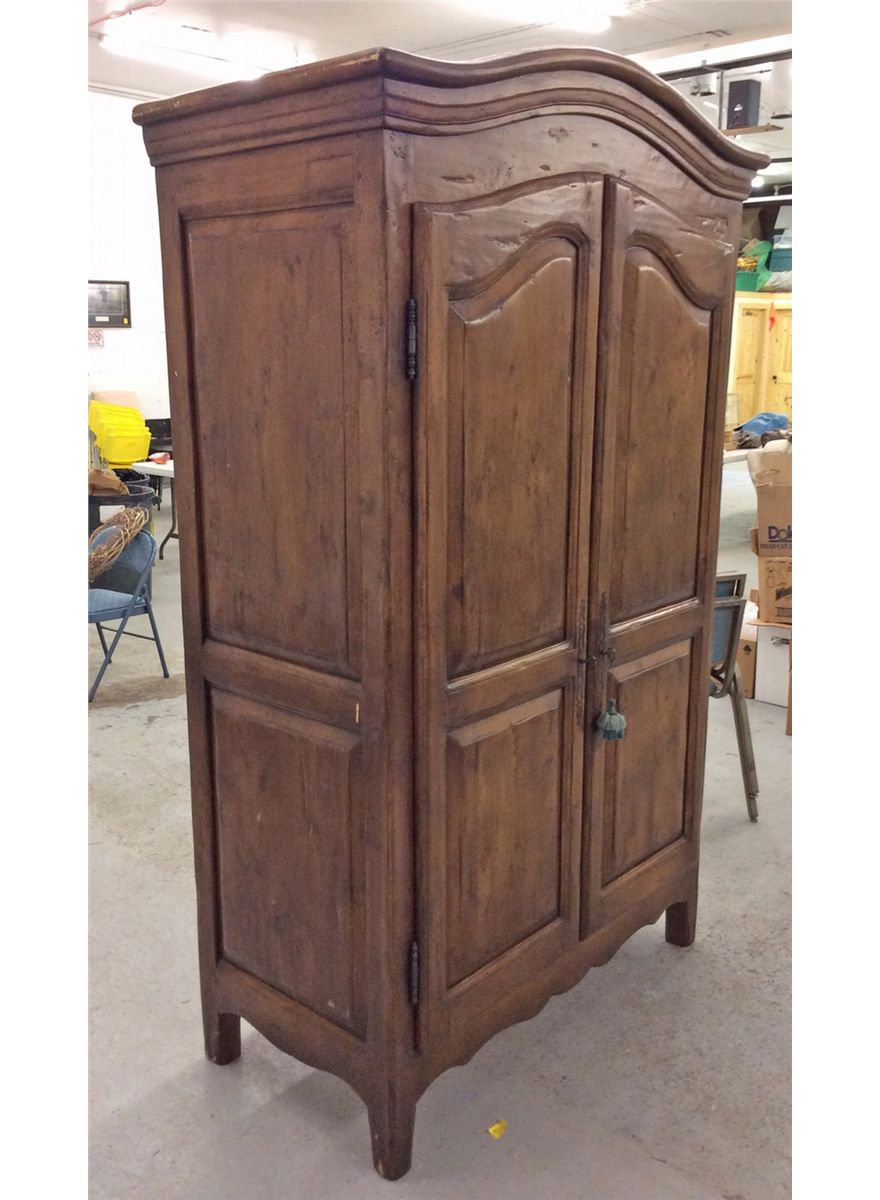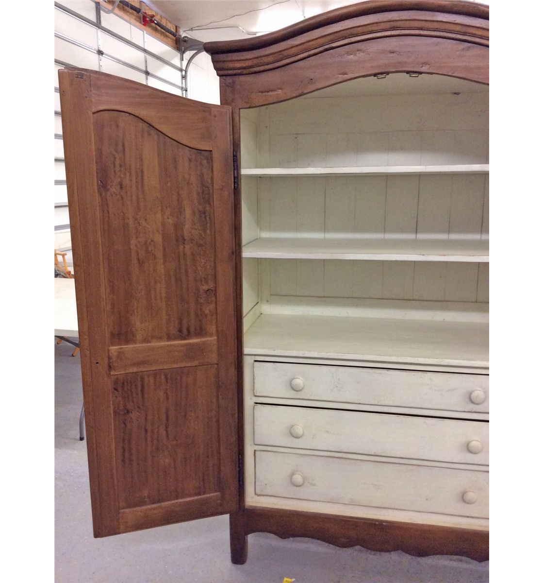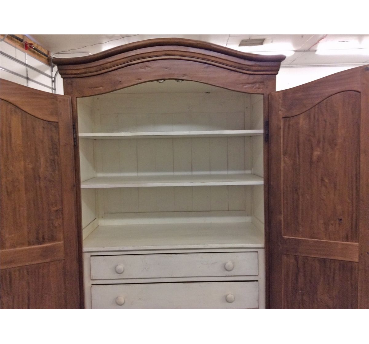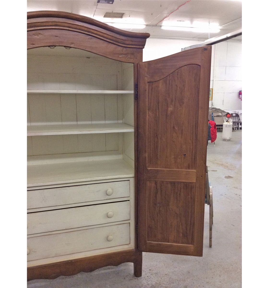 Maurice Armoire, The Farm House Collection, Style #4000048. 48 inch wide x 24 inch deep x 84 inch high. Normandy finish stain, No Motif, Three drawers, Two Adjustable shelves, full door, Doue White Interior