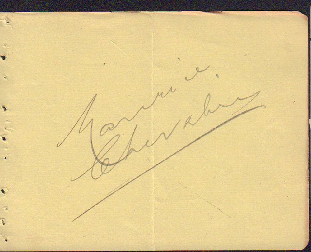 Autograph book page signed by Maurice Chevalier. The page was folded in half at some point. All items come with a certificate of authenticity good for the life of the piece.