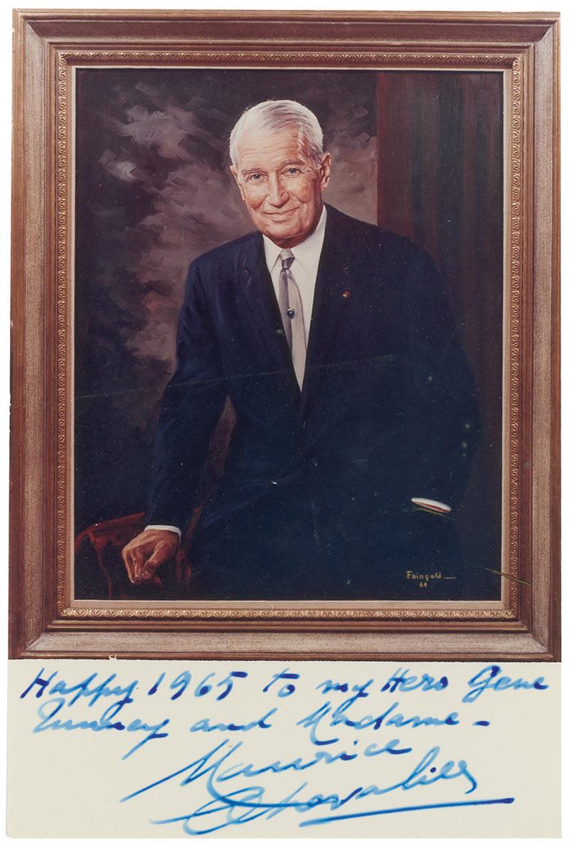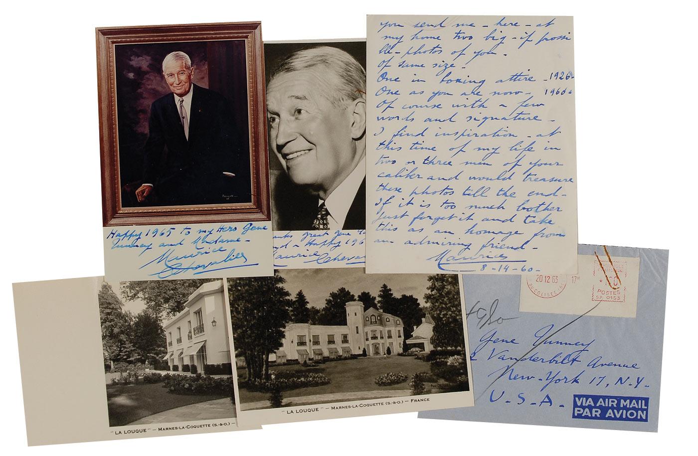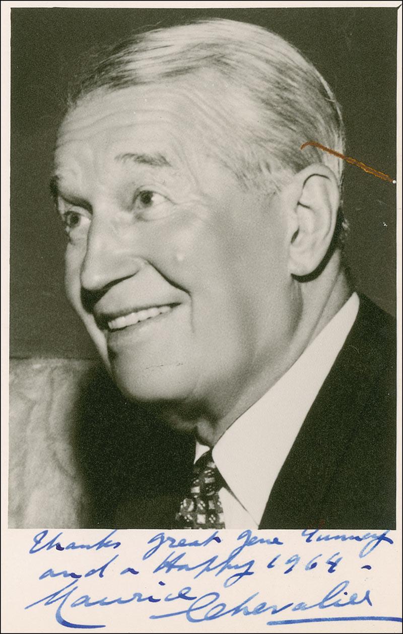 Three signed glossy and matte-finish photos, one color, ranging in size from 3.25 x 5.25 up to 5 x 6. The two smaller ones are signed and inscribed to Gene Tunney and dated 1964 and 1965. The largest photo bears a lengthy handwritten note from Chevalier to Tunney, reading, in part: “Would you–could you send me…photos of you of same size. One in boxing attire 1926. One as you are now 1960…I find inspiration at this time of my life in two or three men of your caliber and would treasure the photo till the end.” A rusty paperclip mark to edge of smaller photo, and a couple slight brushes to text of note, otherwise fine condition.