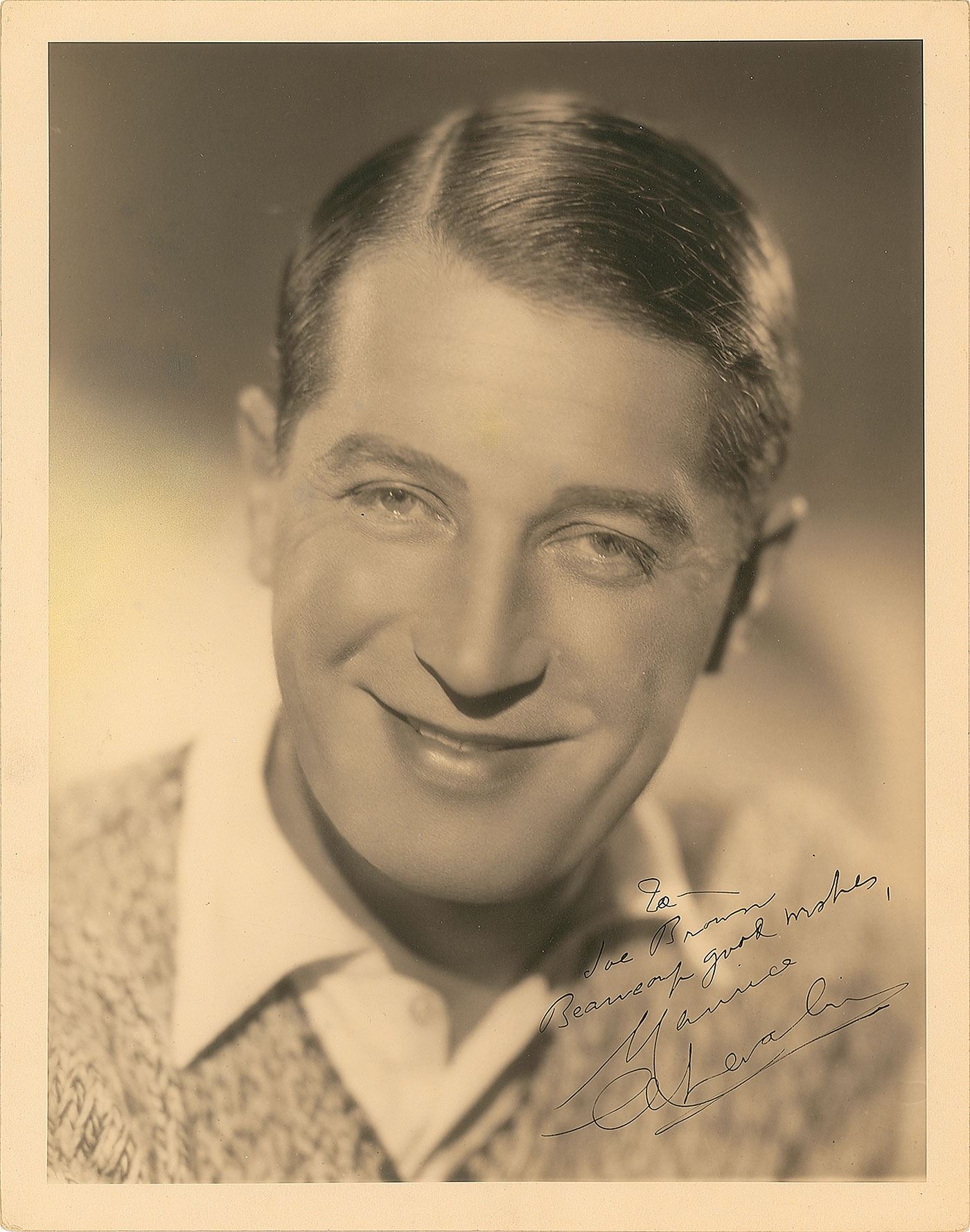 Vintage matte-finish 11 x 14 close-up portrait of a smiling Chevalier, signed and inscribed in fountain pen, "To-Joe Brown, Beaucoup good wishes, Maurice Chevalier." In fine condition.