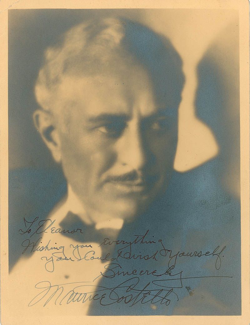 Prominent vaudeville actor (1877–1950) who played the first on-screen Sherlock Holmes and discovered Moe of the Three Stooges. Vintage sepia matte-finish 6.5 x 8.5 photo of Costello in a tuxedo, signed and inscribed in fountain pen “To Eleanor, Wishing you everything you could wish yourself. Sincerely, Maurice Costello.” A crease to the upper left corner tip and moderate silvering to dark areas of the image, otherwise fine condition.